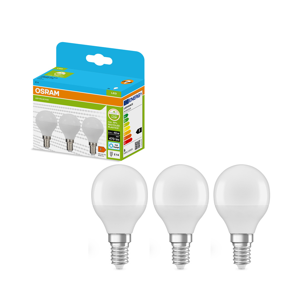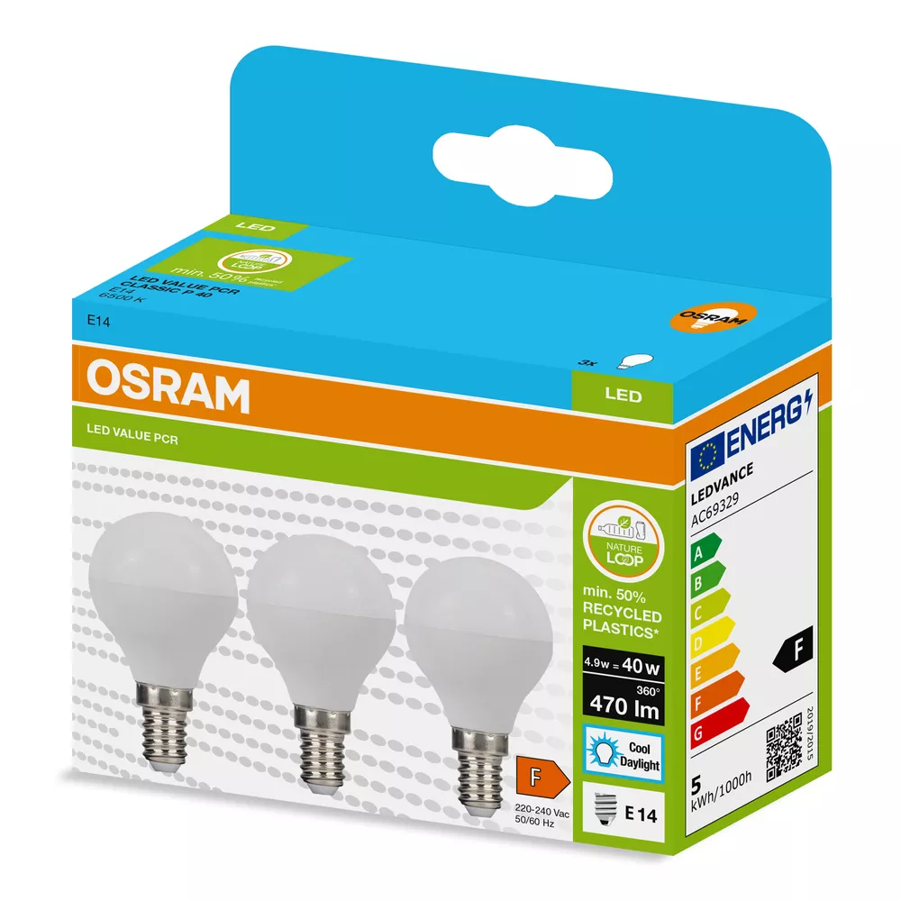 Lampy LED w kształcie LED CLASSIC P wykonane z przetworzonego plastiku. Cechy produktu: Profesjonalne lampy dla napięcia sieciowego. Brak możliwości regulacji strumienia świetlnego. Użyto co najmniej 50% plastiku pochodzącego z recyklingu (w stosunku do całkowitej masy plastiku). Trwałość do 15 000 h. Dobra jakość światła, wskaźnik oddawania barw Ra: ≥ 80; stała chromatyczność. Zalety produktu: Niższe zużycie energii w porównaniu do lamp żarowych lub halogenowych. Prosty w użyciu zamiennik żarówek klasycznych dzięki kompaktowej konstrukcji. Natychmiast 100 % światła, bez czasu nagrzewania. Wykonana z tworzyw sztucznych pochodzących z recyklingu lampa przyczynia się do ograniczenia emisji CO2 i ilości odpadów składowanych na wysypiskach. Obszary zastosowań: Zastosowania domowe. Oświetlenie ogólne. Do użytku na zewnątrz tylko w odpowiednich oprawach zewnętrznych. Porady dotyczące bezpieczeństwa: Nie dotykaj lampy, jeśli jest stłuczona.. Nie wolno używać, jeśli zewnętrzne źródło światła jest uszkodzone..