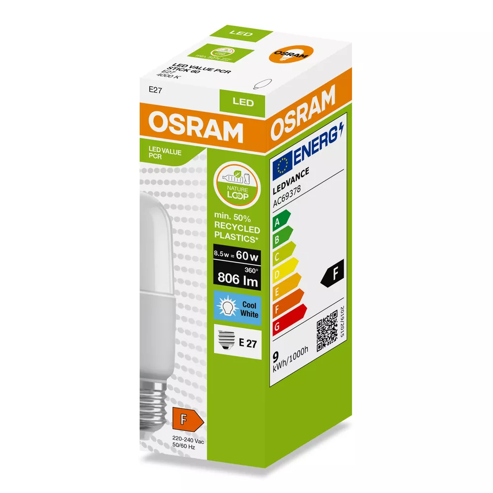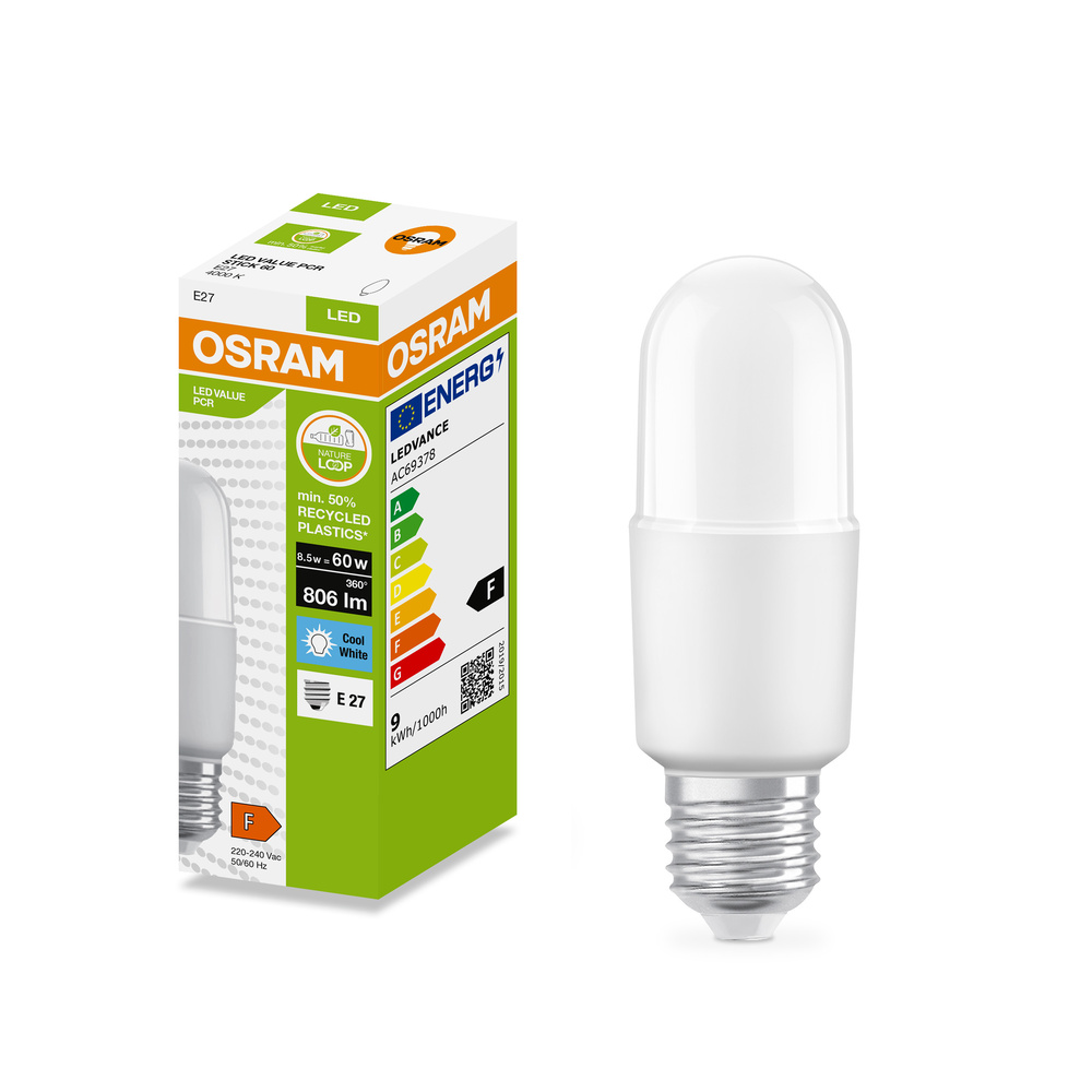 Lampy LED w kształcie STICK wykonane z przetworzonego plastiku. Cechy produktu: LED zamienniki tradycyjnych żarówek. Trwałość do 15 000 h. Brak możliwości regulacji strumienia świetlnego. Użyto co najmniej 50% plastiku pochodzącego z recyklingu (w stosunku do całkowitej masy plastiku). Dobra jakość światła, wskaźnik oddawania barw Ra: ≥ 80; stała chromatyczność. Zalety produktu: Niższe zużycie energii w porównaniu do lamp żarowych lub halogenowych. Atrakcyjny wygląd lamp. Natychmiast 100 % światła, bez czasu nagrzewania. Wykonana z tworzyw sztucznych pochodzących z recyklingu lampa przyczynia się do ograniczenia emisji CO2 i ilości odpadów składowanych na wysypiskach. Obszary zastosowań: Wszystkie pomieszczenia mieszkalne, zwłaszcza tam, gdzie lampy są widoczne. Tam, gdzie potrzebne są wydajne lampy kompaktowe. Do użytku na zewnątrz tylko w odpowiednich oprawach zewnętrznych. Porady dotyczące bezpieczeństwa: Nie dotykaj lampy, jeśli jest stłuczona.. Nie wolno używać, jeśli zewnętrzne źródło światła jest uszkodzone..