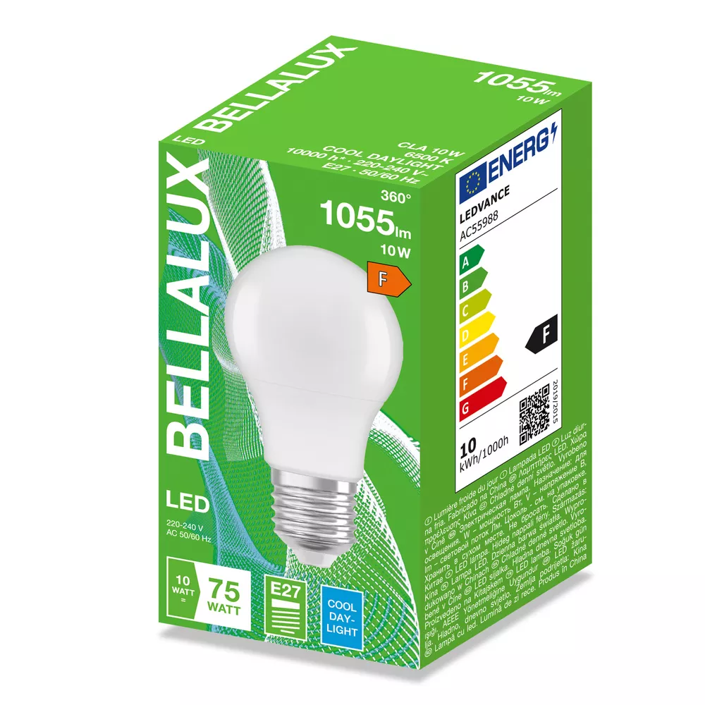 Lampy LED, klasyczny kształt żarówki. Cechy produktu: Lampy LED dla napięcia sieciowego. Brak możliwości regulacji strumienia świetlnego. Lampy niezawierające rtęci. Zalety produktu: Niższe zużycie energii w porównaniu do lamp żarowych lub halogenowych. Odporność na wstrząsy i drgania dzięki technologii LED. Brak promieniowania UV w wiązce światła. Natychmiast 100 % światła, bez czasu nagrzewania. Łatwy montaż zamiast zwykłych żarówek. Niskie obciążenie cieplne (w porównaniu ze standardowym produktem referencyjnym). Obszary zastosowań: Zastosowania domowe. Oświetlenie ogólne. Eksploatacja na zewnątrz wyłącznie w oprawach zewnętrznych (co najmniej IP65). Porady dotyczące bezpieczeństwa: Nie dotykaj lampy, jeśli jest stłuczona.. Nie wolno używać, jeśli zewnętrzne źródło światła jest uszkodzone..