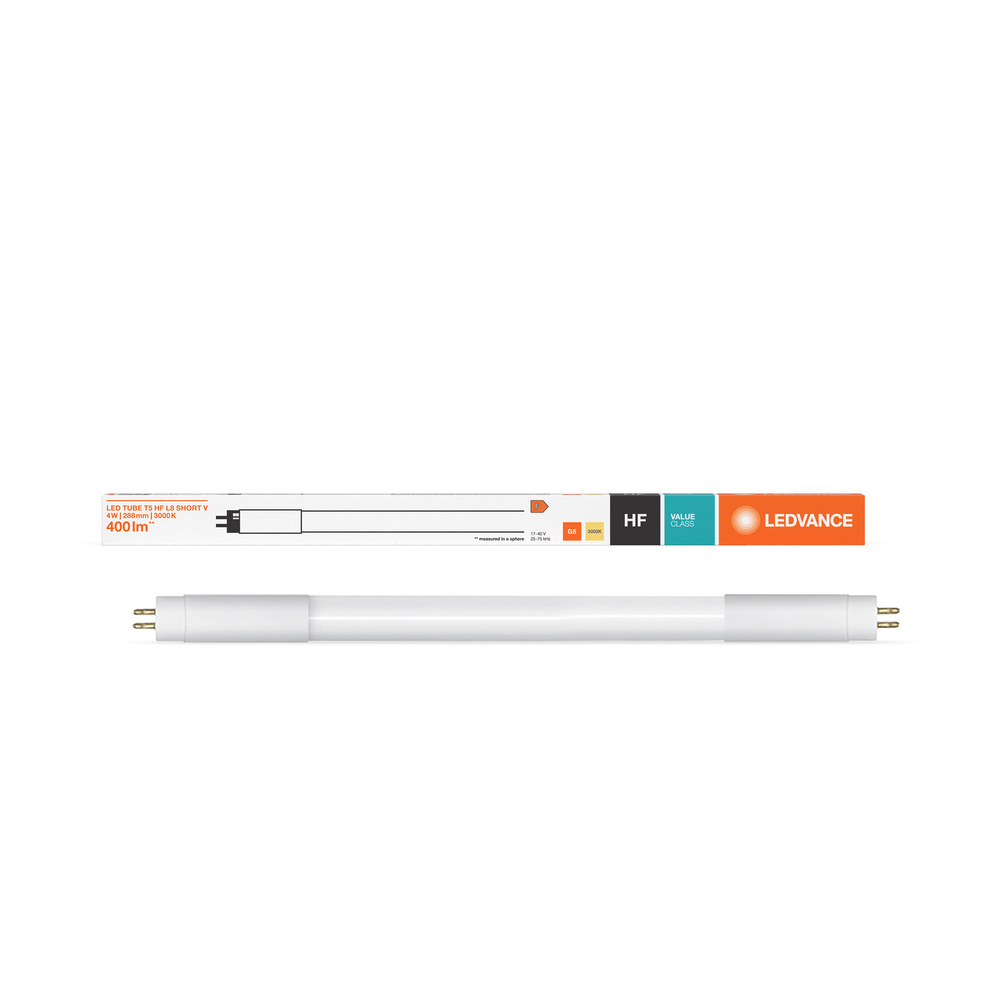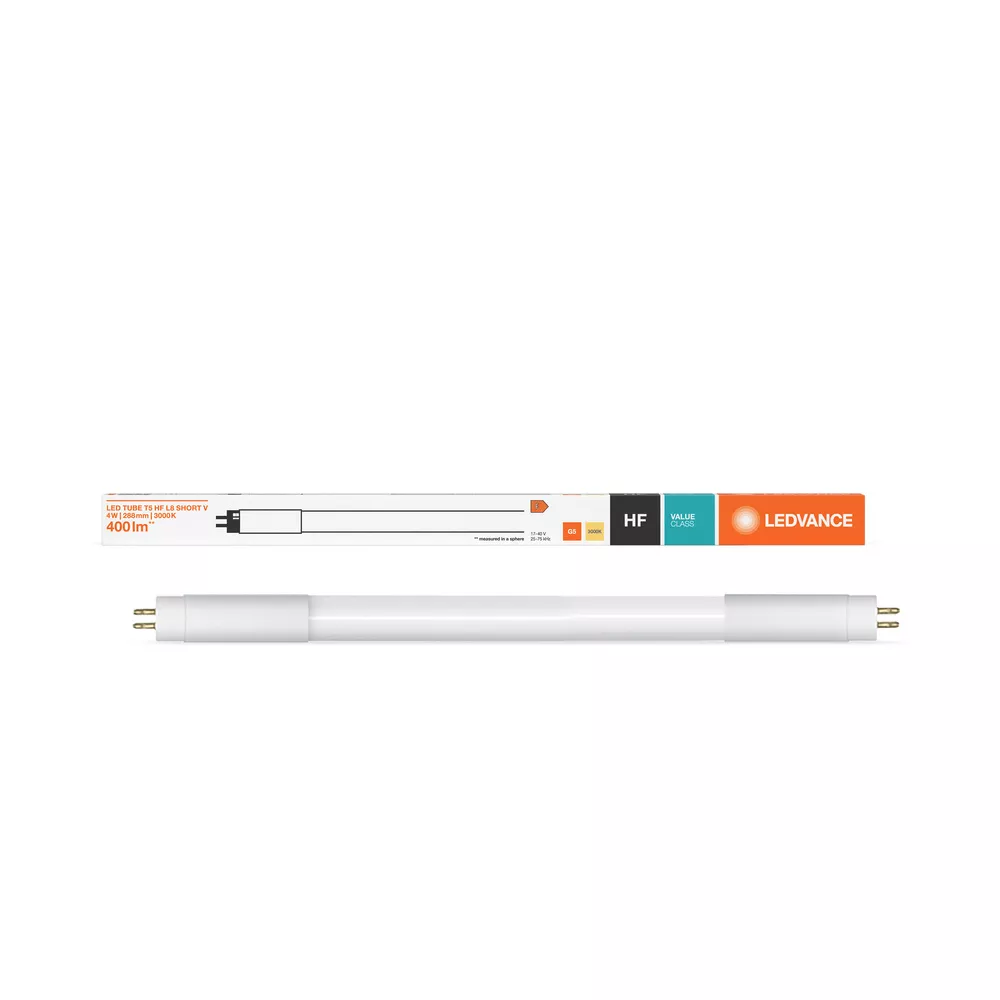Tuby LED do zasilania przez elektroniczne stateczniki (ECG), zabezpieczone przed odłamkami szkła . Cechy produktu: Zamiennik świetlówek liniowych T5 w instalacjach ze statecznikami elektronicznymi. Tuba LED wykonana ze szkła z zabezpieczeniem przed odpryskami. Wysoka jedorodność barw: ≤ 5 sdcm. Trwałość: do 30 000 h. Niskie tętnienie światła zgodnie z UE 2019/2020 (SVM ≤ 0,4 / PstLM ≤ 1). Stopień ochrony: IP20. Kompatybilność z popularnymi statecznikami elektronicznymi (patrz również compatibility list). Zalety produktu: Lampa nie ugina się dzięki rurce wykonanej ze szkła. Szybka, prosta i bezpieczna wymiana bez zmiany okablowania. Nadaje się również do pracy w niskich temperaturach. Prosimy o przestrzeganie wszystkich zaleceń dotyczących bezpieczeństwa. Obszary zastosowań: Oświetlenie ogólne – dla temperatur otoczenia w zakresie -20…+45 °C. Budynki publiczne. Kuchnie. Oświetlenie pod szafkami. Porady prawne: W przypadku zastąpienia świetlówki T5 całkowita efektywność energetyczna i rozsył światła zależą od projektu systemu oświetleniowego.. Porady dotyczące bezpieczeństwa: Możliwa praca w zastosowaniach zewnętrznych w odpowiednich oprawach odpornych na wilgoć zgodnie z kartą katalogową i instrukcją instalacji.. Zakres temperatur pracy tub LED jest ograniczony. W przypadku wątpliwości, należy zmierzyć temperaturę w punkcie Tc oznaczonym na lampie w celu weryfikacji.. Nie nadaje się do oświetlenia awaryjnego..