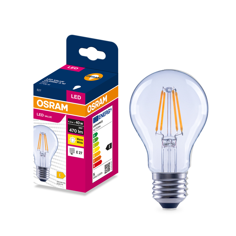 Lampy LED, klasyczny kształt żarówki. Cechy produktu: LED zamienniki tradycyjnych żarówek. Kąt wiązki światła: do 300°. Trwałość do 15 000 h. Dobre oddawanie barw (Ra ≥ 80) i stabilność braw przez cały czas eksploatacji lampy. Brak możliwości regulacji strumienia świetlnego. Zalety produktu: Wygląd, wymiary i strumień świetlny porównywalne z tradycyjnymi żarówkami lub żarówkami halogenowymi. Niższe zużycie energii w porównaniu do lamp żarowych lub halogenowych. Brak promieniowania UV i podczerwonego w wiązce światła. Łatwy montaż zamiast zwykłych żarówek. Natychmiast 100 % światła, bez czasu nagrzewania. Obszary zastosowań: Doskonałe rozwiązanie do instalacji dekoracyjnych. Zastosowania domowe. Oświetlenie ogólne. Do użytku na zewnątrz tylko w odpowiednich oprawach zewnętrznych. Porady dotyczące bezpieczeństwa: Nie dotykaj lampy, jeśli jest stłuczona.. Nie wolno używać, jeśli zewnętrzne źródło światła jest uszkodzone..