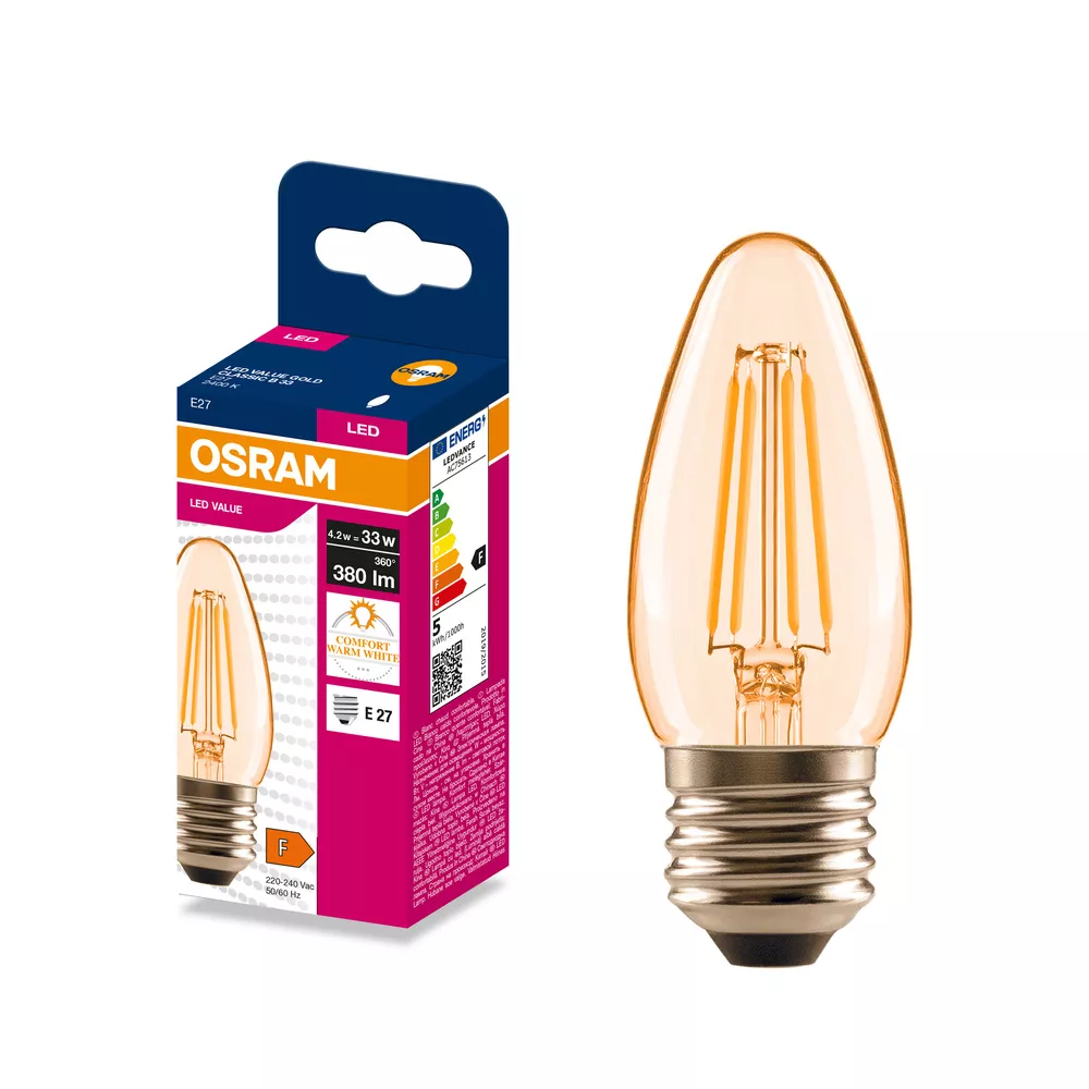 Lampki LED , klasyczny kształt świecy. Cechy produktu: LED zamienniki tradycyjnych żarówek. Kąt wiązki światła: do 300°. Trwałość do 15 000 h. Dobre oddawanie barw (Ra ≥ 80) i stabilność braw przez cały czas eksploatacji lampy. Brak możliwości regulacji strumienia świetlnego. Zalety produktu: Wygląd, wymiary i strumień świetlny porównywalne z tradycyjnymi żarówkami lub żarówkami halogenowymi. Niższe zużycie energii w porównaniu do lamp żarowych lub halogenowych. Brak promieniowania UV i podczerwonego w wiązce światła. Łatwy montaż zamiast zwykłych żarówek. Natychmiast 100 % światła, bez czasu nagrzewania. Obszary zastosowań: Doskonałe rozwiązanie do instalacji dekoracyjnych. Zastosowania domowe. Oświetlenie ogólne. Do użytku na zewnątrz tylko w odpowiednich oprawach zewnętrznych. Porady dotyczące bezpieczeństwa: Nie dotykaj lampy, jeśli jest stłuczona.. Nie wolno używać, jeśli zewnętrzne źródło światła jest uszkodzone..