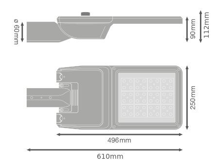 Rozsył strumienia świetlnego przystosowany do oświetlenia drogowego. Cechy produktu: Temperatura barwowa: 2200 K, 2700 K, 3000 K, 4000 K, 5700 K. Rozsył światła zoptymalizowany dla ulic o szerokości zbliżonej do wysokości słupa. Bardzo długa trwałość (L90/B10): do 100 000 godzin (przy 25 °C). W zestawie czop na słupy o średnicy 48-60 mm. Oprawa przystosowana do montażu bocznego lub na szczycie słupa. Regulacja kąta nachylenia +/- 15° bez otwierania obudowy. Wysoka skuteczność świetlna: do 180 lm/W. Zakres temperatury pracy: -40...50 °C. Wysoka ochrona przed przepięciami: do 10 kV (L/N-GND). Klasa ochronności: I i II. Certyfikat: ENEC+, ENEC, ZD4i RoHS, SASO. Stopień ochrony: IP66. Zalety produktu: Trwała konstrukcja i komponenty najwyższej jakości zapewniają długą trwałość. Szybkie i łatwe okablowanie oprawy dzięki otwieraniu obudowy bez użycia narzędzi i zaciskom przyciskowym. Wysoka jednorodność światła. Dostępne 5 barw światła, doskonale nadające się do oświetlenia bardzo zróżnicowanego otoczenia. Brak górnego współczynnika rozsyłu światła (ULOR 0%) w przypadku zamontowania pod kątem 0°. Automatyczne wyłączanie zasilania podczas otwierania obudowy. 5-letnia gwarancja. Obszary zastosowań: Oświetlenie drogowe, oświetlenie miejskie. Zastosowania zewnętrzne. Miejskie ulice, drogi przemysłowe, parkingi. Drogi klasy M, C i P wg. Wymagań PN- EN 13201. Strefy dla pieszych. Strefy publiczne. Przemysł. Porady dotyczące bezpieczeństwa: Wszystkie podłączenia elektryczne muszą być wykonane przez osobę wykwalifikowaną.. Uwaga, ryzyko porażenia prądem..
