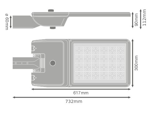 Rozsył strumienia świetlnego przystosowany do oświetlenia drogowego. Cechy produktu: Temperatura barwowa: 2200 K, 2700 K, 3000 K, 4000 K, 5700 K. Rozsył światła zoptymalizowany dla ulic o szerokości zbliżonej do wysokości słupa. Bardzo długa trwałość (L90/B10): do 100 000 godzin (przy 25 °C). W zestawie czop na słupy o średnicy 48-60 mm. Oprawa przystosowana do montażu bocznego lub na szczycie słupa. Regulacja kąta nachylenia +/- 15° bez otwierania obudowy. Wysoka skuteczność świetlna: do 180 lm/W. Zakres temperatury pracy: -40...50 °C. Wysoka ochrona przed przepięciami: do 10 kV (L/N-GND). Klasa ochronności: I i II. Certyfikat: ENEC+, ENEC, ZD4i RoHS, SASO. Stopień ochrony: IP66. Zalety produktu: Trwała konstrukcja i komponenty najwyższej jakości zapewniają długą trwałość. Szybkie i łatwe okablowanie oprawy dzięki otwieraniu obudowy bez użycia narzędzi i zaciskom przyciskowym. Wysoka jednorodność światła. Dostępne 5 barw światła, doskonale nadające się do oświetlenia bardzo zróżnicowanego otoczenia. Brak górnego współczynnika rozsyłu światła (ULOR 0%) w przypadku zamontowania pod kątem 0°. Automatyczne wyłączanie zasilania podczas otwierania obudowy. 5-letnia gwarancja. Obszary zastosowań: Oświetlenie drogowe, oświetlenie miejskie. Zastosowania zewnętrzne. Miejskie ulice, drogi przemysłowe, parkingi. Drogi klasy M, C i P wg. Wymagań PN- EN 13201. Strefy dla pieszych. Strefy publiczne. Przemysł. Porady dotyczące bezpieczeństwa: Wszystkie podłączenia elektryczne muszą być wykonane przez osobę wykwalifikowaną.. Uwaga, ryzyko porażenia prądem..