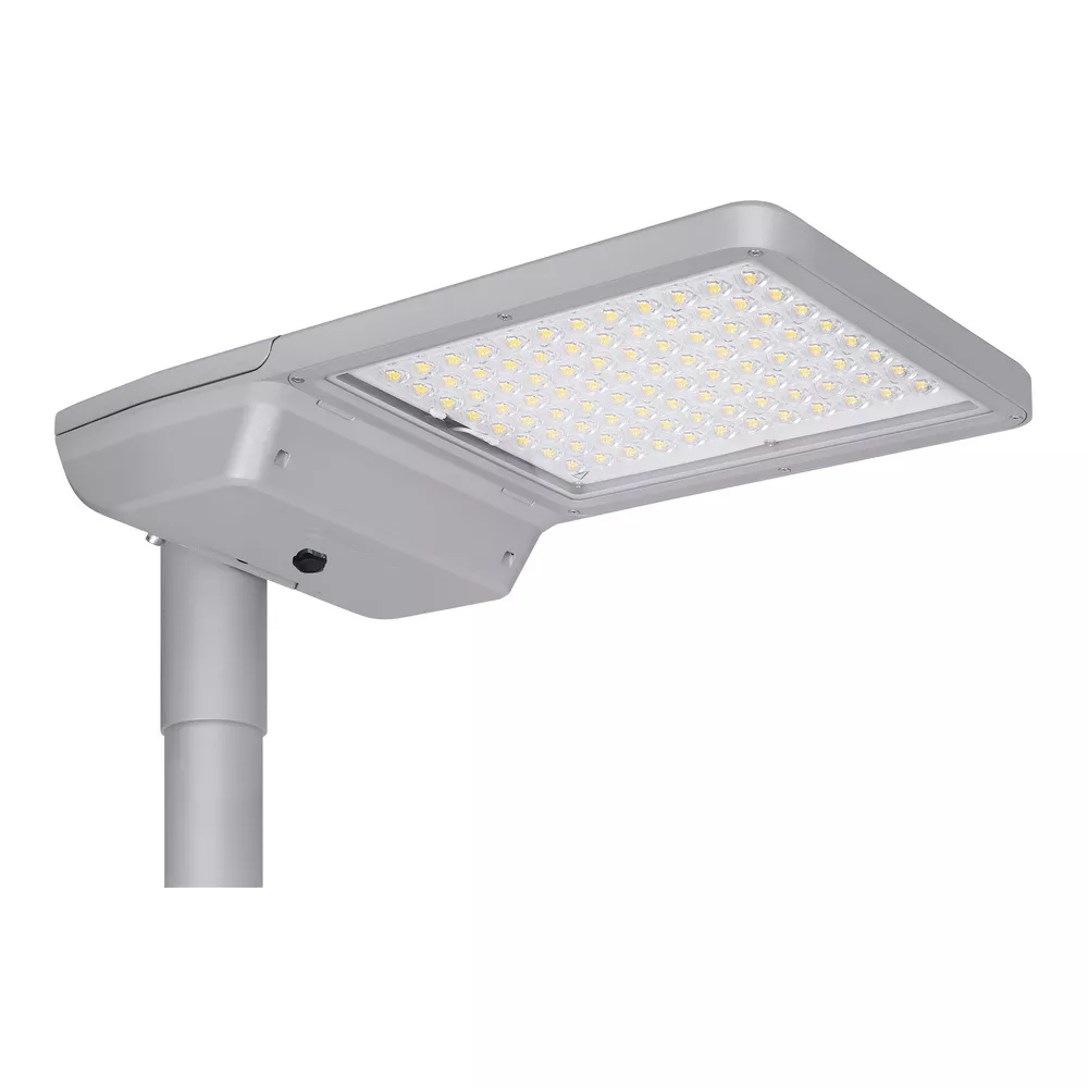 Rozsył strumienia świetlnego przystosowany do oświetlenia drogowego. Cechy produktu: Temperatura barwowa: 2200 K, 2700 K, 3000 K, 4000 K, 5700 K. Rozsył światła zoptymalizowany dla ulic o szerokości zbliżonej do wysokości słupa. Bardzo długa trwałość (L90/B10): do 100 000 godzin (przy 25 °C). W zestawie czop na słupy o średnicy 48-60 mm. Oprawa przystosowana do montażu bocznego lub na szczycie słupa. Regulacja kąta nachylenia +/- 15° bez otwierania obudowy. Wysoka skuteczność świetlna: do 180 lm/W. Zakres temperatury pracy: -40...50 °C. Wysoka ochrona przed przepięciami: do 10 kV (L/N-GND). Klasa ochronności: I i II. Certyfikat: ENEC+, ENEC, ZD4i RoHS, SASO. Stopień ochrony: IP66. Zalety produktu: Trwała konstrukcja i komponenty najwyższej jakości zapewniają długą trwałość. Szybkie i łatwe okablowanie oprawy dzięki otwieraniu obudowy bez użycia narzędzi i zaciskom przyciskowym. Wysoka jednorodność światła. Dostępne 5 barw światła, doskonale nadające się do oświetlenia bardzo zróżnicowanego otoczenia. Brak górnego współczynnika rozsyłu światła (ULOR 0%) w przypadku zamontowania pod kątem 0°. Automatyczne wyłączanie zasilania podczas otwierania obudowy. 5-letnia gwarancja. Obszary zastosowań: Oświetlenie drogowe, oświetlenie miejskie. Zastosowania zewnętrzne. Miejskie ulice, drogi przemysłowe, parkingi. Drogi klasy M, C i P wg. Wymagań PN- EN 13201. Strefy dla pieszych. Strefy publiczne. Przemysł. Porady dotyczące bezpieczeństwa: Wszystkie podłączenia elektryczne muszą być wykonane przez osobę wykwalifikowaną.. Uwaga, ryzyko porażenia prądem..