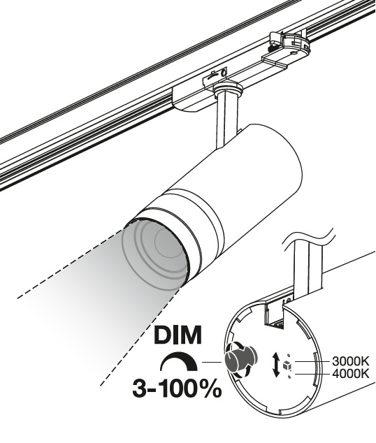 Ściemnialny TRACKLIGHT SPOT 3-fazowy z soczewką z zoomem mechanicznym i przełącznikiem CCT. Cechy produktu: Funkcja Multi Color: 3000 K i 4000 K. Mechaniczny obiektyw z zoomem o kącie wiązki od 21° do 50°. Możliwość ściemniania (3% - 100%) za pomocą potencjometru umieszczonego na każdej oprawie. Wskaźnik oddawania barw Ra 90 . Początkowa jednolitość barw: ≤ 3 SDCM. Kąt obrotu: 350°, kąt odchylenia: 90°. Trwała obudowa wykonana z odlewu aluminiowego. Dostępne w kolorze matowej bieli (np. RAL9003), matowej czerni (np. RAL9005). Skuteczność świetlna: do 120 lm/W. Zalety produktu: 3-fazowe oprawy punktowe, z możliwością ściemnianiania, klosz z mechaniczną regulacją zoom. Brak rozpraszania uwagi przez oświetlone obiekty dzięki smukłej konstrukcji. Niewielkie tętnienie światła dzięki specjalnemu statecznikowi elektronicznemu. Obszary zastosowań: Bezpośredni zamiennik opraw oświetleniowych wykorzystujących lampy wyładowcze. Oświetlenie akcentujące. Galerie, muzea. Sklepy, przebieralnie, witryny sklepowe. Hotele, restauracje. Porady dotyczące bezpieczeństwa: Wszystkie podłączenia elektryczne muszą być wykonane przez osobę wykwalifikowaną.. Uwaga, ryzyko porażenia prądem.. Produkt w klasie ochrony I. Wszystkie przewodzące prąd, metalowe części obudowy, które mogą absorbować napięcie podczas pracy lub podczas konserwacji w przypadku awarii, muszą być stale PODŁĄCZONE do przewodu uziemiającego..