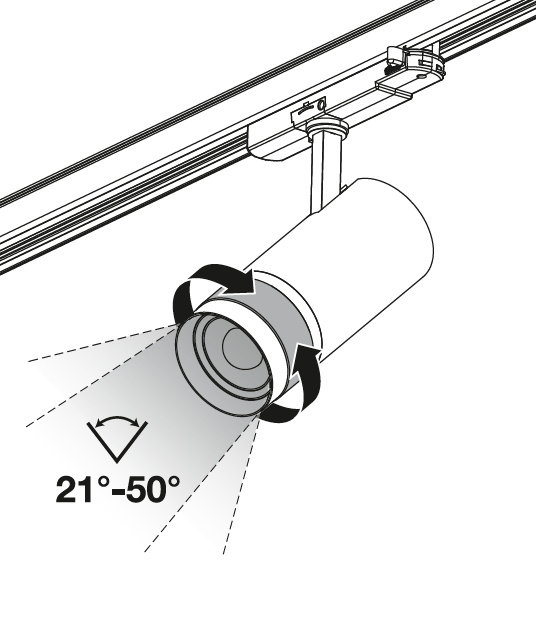 Ściemnialny TRACKLIGHT SPOT 3-fazowy z soczewką z zoomem mechanicznym i przełącznikiem CCT. Cechy produktu: Funkcja Multi Color: 3000 K i 4000 K. Mechaniczny obiektyw z zoomem o kącie wiązki od 21° do 50°. Możliwość ściemniania (3% - 100%) za pomocą potencjometru umieszczonego na każdej oprawie. Wskaźnik oddawania barw Ra 90 . Początkowa jednolitość barw: ≤ 3 SDCM. Kąt obrotu: 350°, kąt odchylenia: 90°. Trwała obudowa wykonana z odlewu aluminiowego. Dostępne w kolorze matowej bieli (np. RAL9003), matowej czerni (np. RAL9005). Skuteczność świetlna: do 120 lm/W. Zalety produktu: 3-fazowe oprawy punktowe, z możliwością ściemnianiania, klosz z mechaniczną regulacją zoom. Brak rozpraszania uwagi przez oświetlone obiekty dzięki smukłej konstrukcji. Niewielkie tętnienie światła dzięki specjalnemu statecznikowi elektronicznemu. Obszary zastosowań: Bezpośredni zamiennik opraw oświetleniowych wykorzystujących lampy wyładowcze. Oświetlenie akcentujące. Galerie, muzea. Sklepy, przebieralnie, witryny sklepowe. Hotele, restauracje. Porady dotyczące bezpieczeństwa: Wszystkie podłączenia elektryczne muszą być wykonane przez osobę wykwalifikowaną.. Uwaga, ryzyko porażenia prądem.. Produkt w klasie ochrony I. Wszystkie przewodzące prąd, metalowe części obudowy, które mogą absorbować napięcie podczas pracy lub podczas konserwacji w przypadku awarii, muszą być stale PODŁĄCZONE do przewodu uziemiającego..
