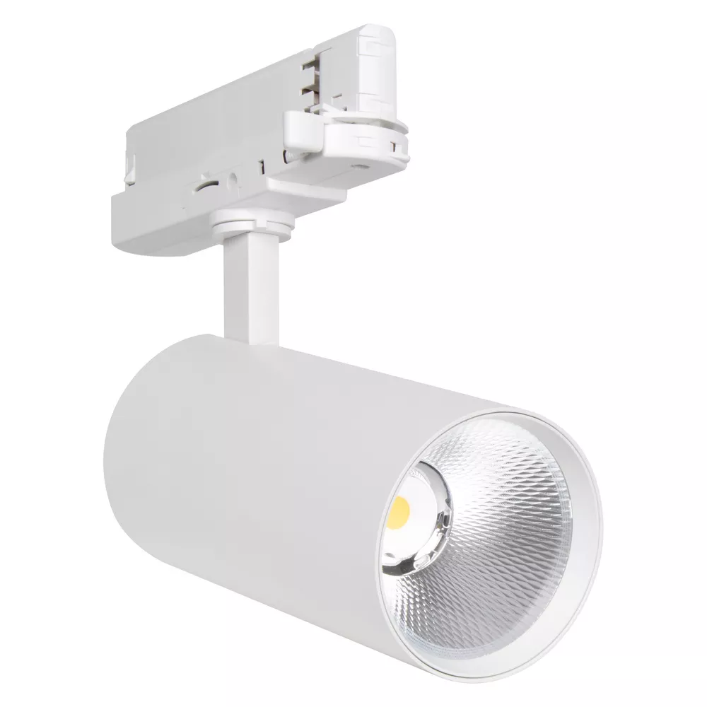 3-fazowy TRACKLIGHT z wymiennym reflektorem. Cechy produktu: Kompaktowe punktowe oprawy LED do montażu szynowego z zasilaczem szynowym. Kąt obrotu: 350°, kąt odchylenia: 90°. Dostępne wersje o temperaturze barwowej: 3000 lub 4000 K. Wskaźnik oddawania barw Ra 90 . Początkowa jednolitość barw: ≤ 3 SDCM. Wyposażone w odbłyśniki, kąt rozsyłu światła 24°. Trwała obudowa wykonana z odlewu aluminiowego. Dostępne w kolorze matowej bieli (np. RAL9003), matowej czerni (np. RAL9005). Skuteczność świetlna: do 120 lm/W. Zalety produktu: Odbłyśnik można łatwo zmienić dzięki zaczepowi bagnetowemu i gumowej przyssawce. Brak rozpraszania uwagi przez oświetlone obiekty dzięki smukłej konstrukcji. Niewielkie tętnienie światła dzięki specjalnemu statecznikowi elektronicznemu. Dobra redukcja olśnienia (UGR ≤ 19). Obszary zastosowań: Bezpośredni zamiennik opraw oświetleniowych wykorzystujących lampy wyładowcze. Oświetlenie akcentujące. Galerie, muzea. Sklepy, przebieralnie, witryny sklepowe. Hotele, restauracje. Wyposażenie / Akcesoria: Dostępne są reflektory dodatkowe o kącie wiązki 15°, 36° lub 50°. Porady dotyczące bezpieczeństwa: Wszystkie podłączenia elektryczne muszą być wykonane przez osobę wykwalifikowaną.. Uwaga, ryzyko porażenia prądem..