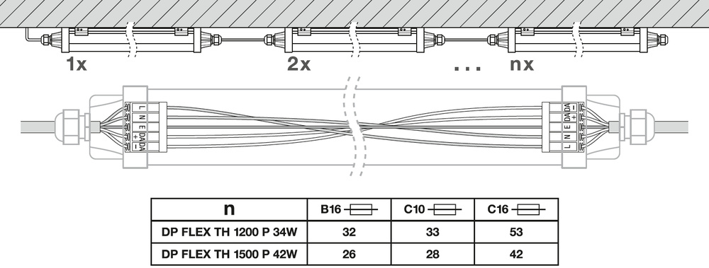 Elastyczne oprawy DAMP PROOF z okablowaniem przelotowym i technologią DALI-2. Cechy produktu: Wysoka skuteczność świetlna: do 162 lm/W