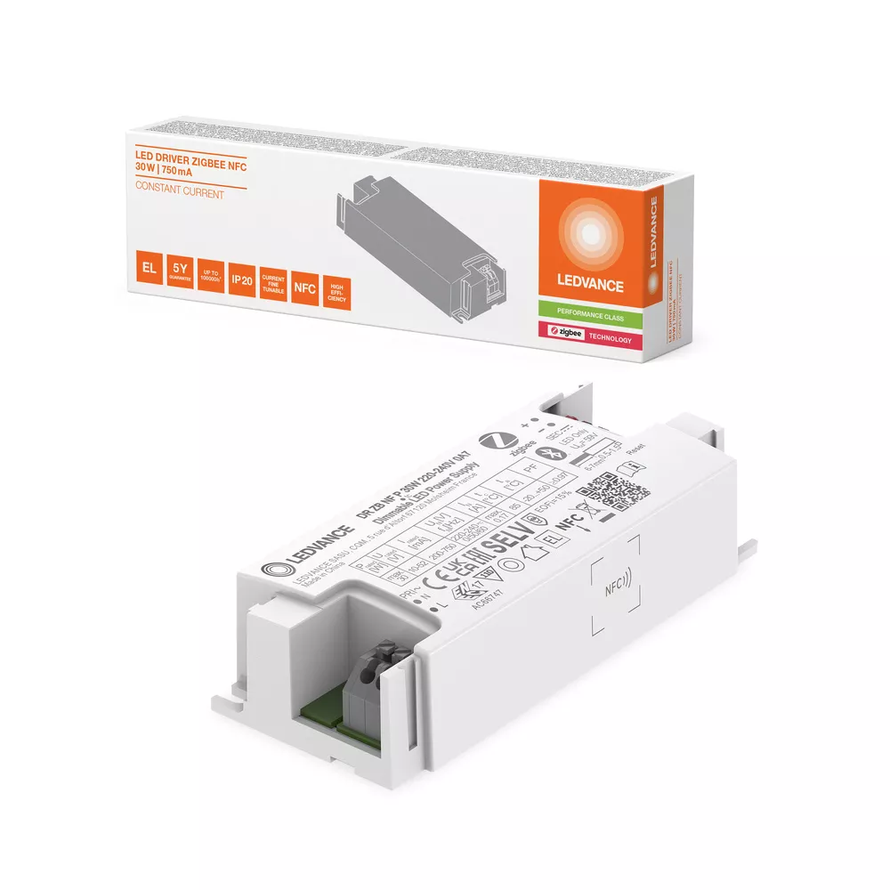 Kompaktowy sterownik LED z interfejsem ściemniania Zigbee. Cechy produktu: Dostępne z zakresem prądu wyjściowego: od 200...750 mA (30 W). Dostępne z zakresem prądu wyjściowego: od 600...1200 mA (45 W). Rodzaj instalacji: niezależna i do wbudowania. Nadaje się do opraw oświetlenia awaryjnego zgodnie z normą EN 60598-2-2 z regulowanym współczynnikiem mocy awaryjnej (EOFI) za pomocą NFC. Szybkie i łatwe ustawianie prądu za pomocą NFC. Bardzo długa żywotność: do 100 000 godzin. Napięcie zasilania: 220…240 V. Praca z bezpiecznym, bardzo niskim napięciem (SELV): < 60 V. Zalety produktu: Zigbee 3.0 i Zigbee Direct przez Bluetooth Low Energy (BLE). Elastyczne ustawienia prądu NFC na urządzeniu w krokach co 1 mA. Dane dotyczące zużycia i diagnostyki za pośrednictwem protokołu Zigbee. Niewielkie tętnienie światła zapewnia wysoką jakość światła oraz dobry komfort wizualny. Wysokiej jakości regulacja mocy w zakresie 1…100 %. Instalacja bez użycia narzędzi. Obszary zastosowań: Oprawy o klasie ochronności I i II. Wewnętrzne instalacje SELV. Nadaje się do LED T5 FC EXTERNAL P. Systemy oświetlenia awaryjnego (z możliwością zasilania prądem stałym). Oświetlenie faset. Biura. Edukacja. Powierzchnie magazynowe. Sprzedaż detaliczna . Wyposażenie / Akcesoria: W zestawie znajdują się zaciski kablowe. Porady dotyczące bezpieczeństwa: Wszystkie podłączenia elektryczne muszą być wykonane przez osobę wykwalifikowaną.. Uwaga, ryzyko porażenia prądem.. Przed instalacją należy odłączyć zasilanie.. Nie otwierać obudowy..