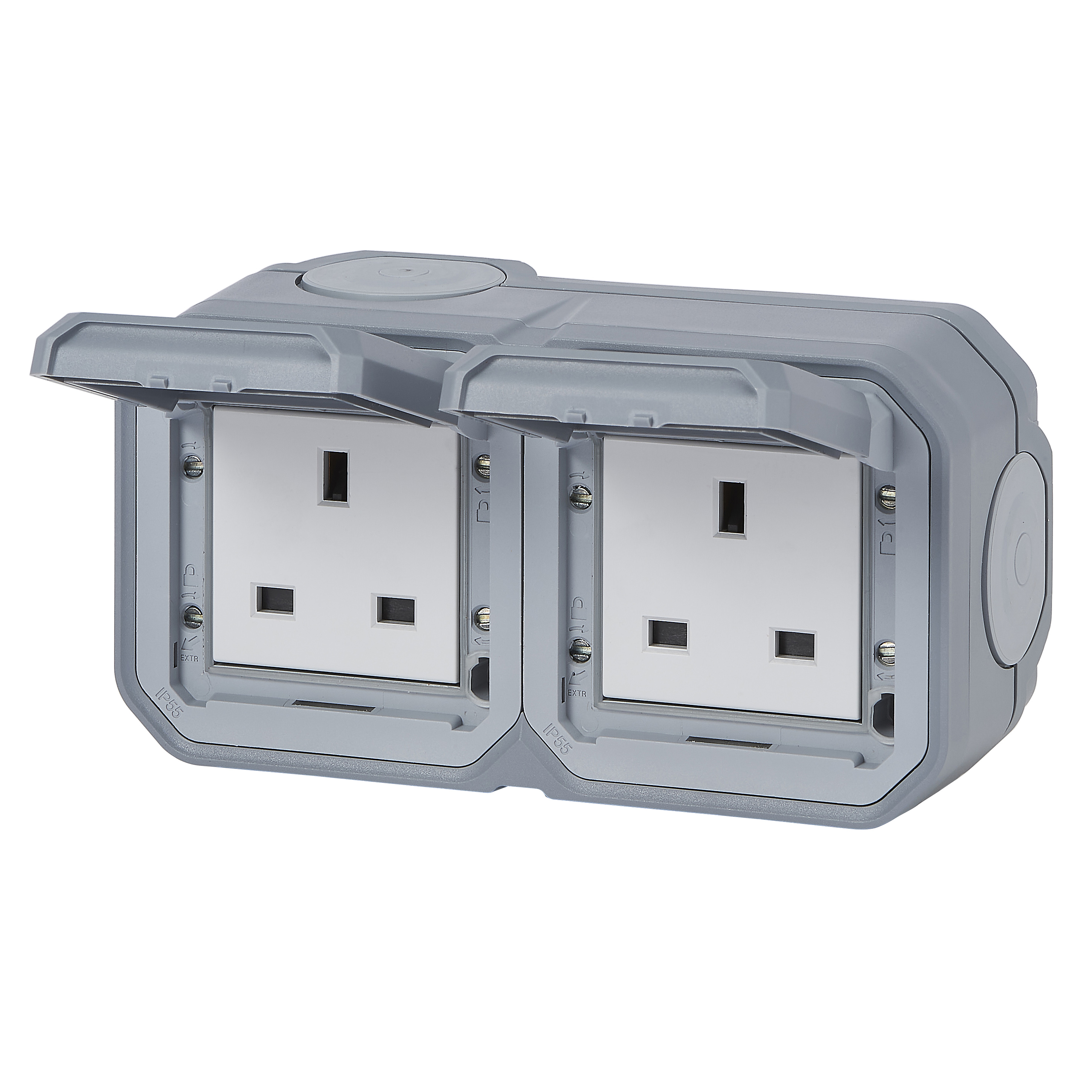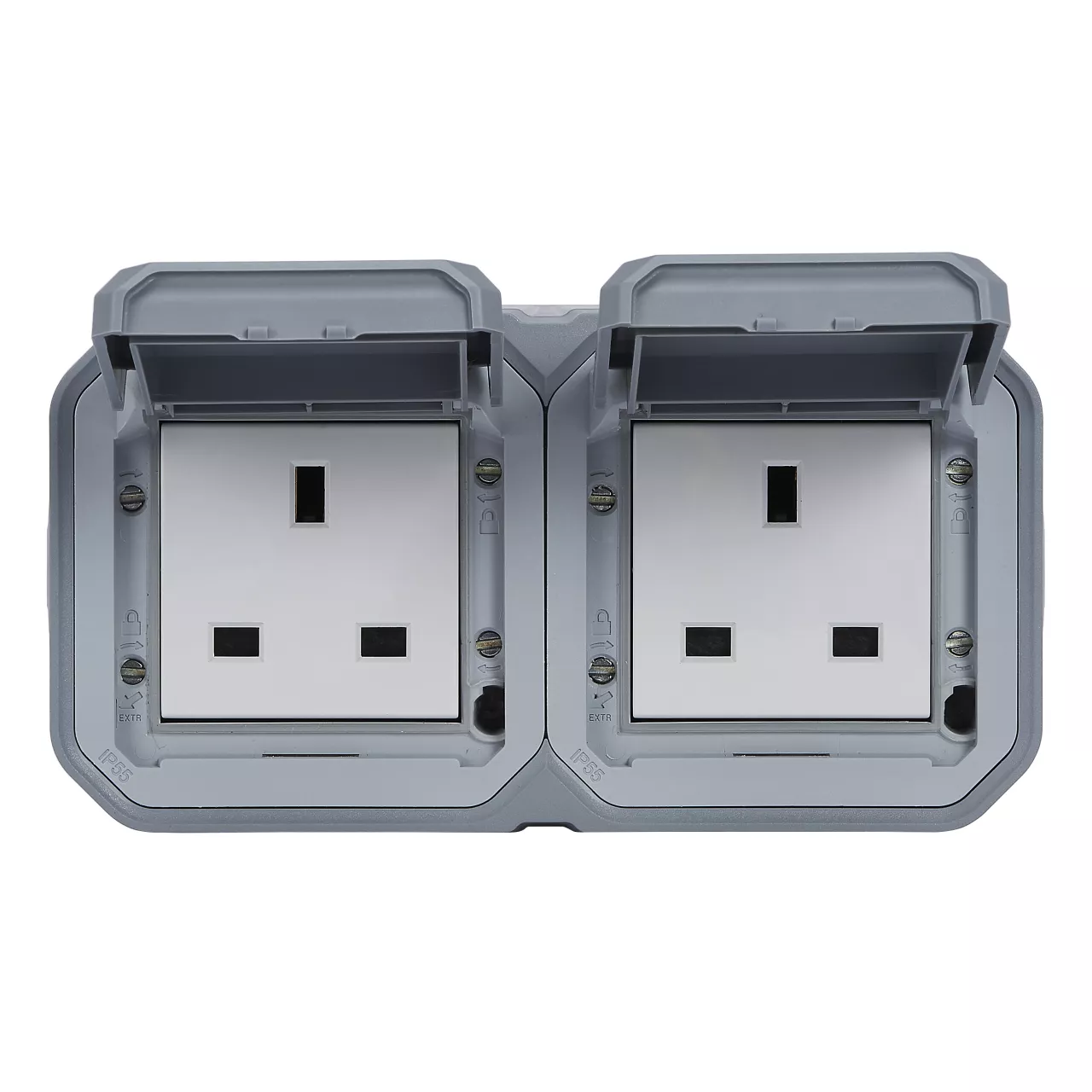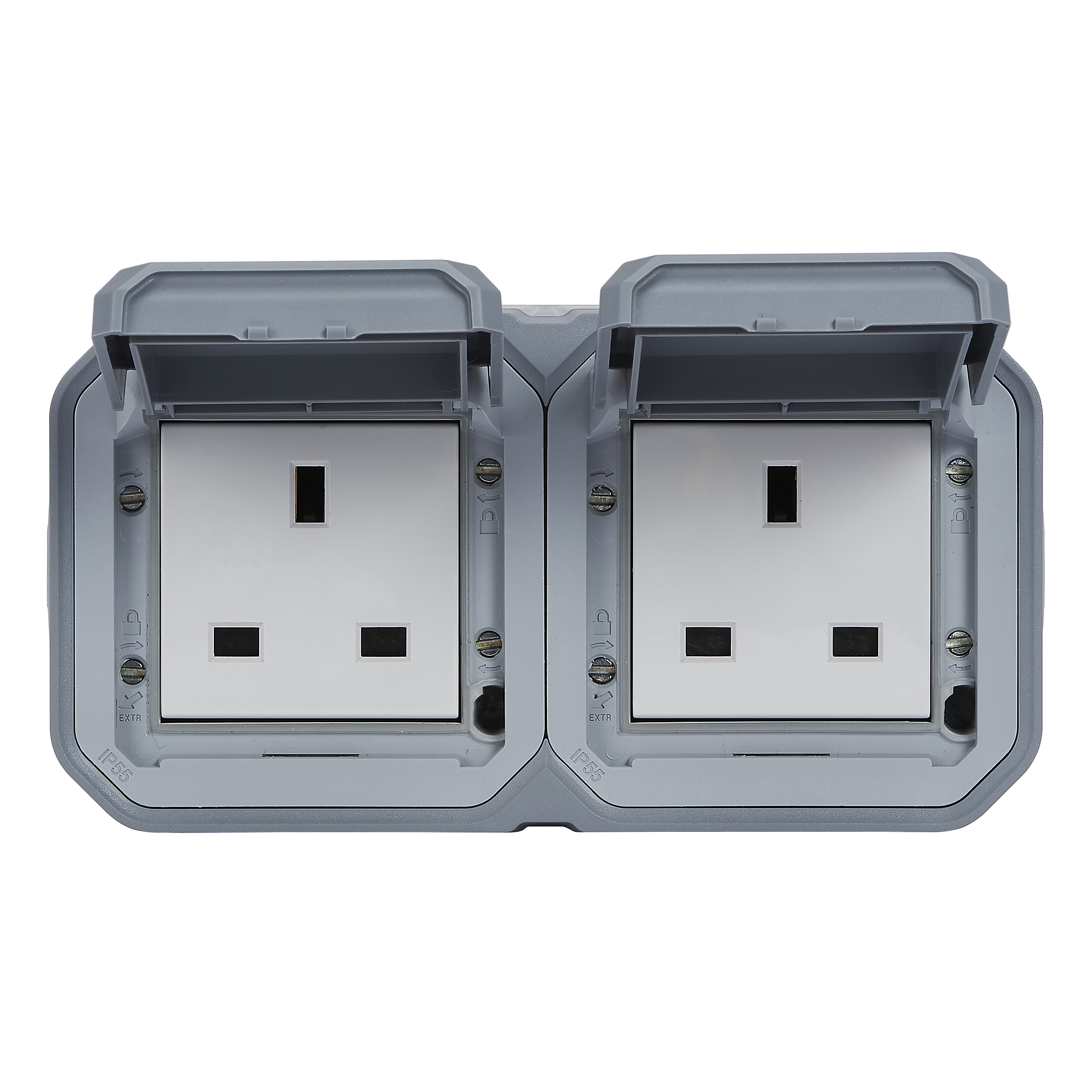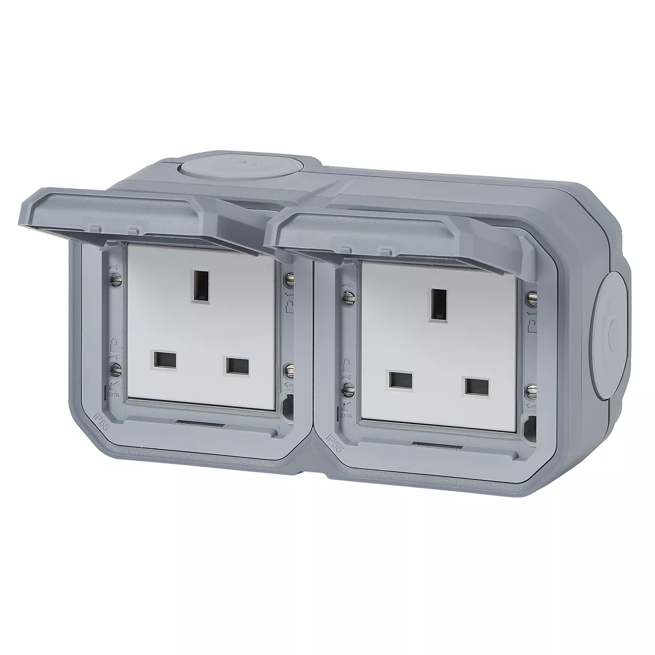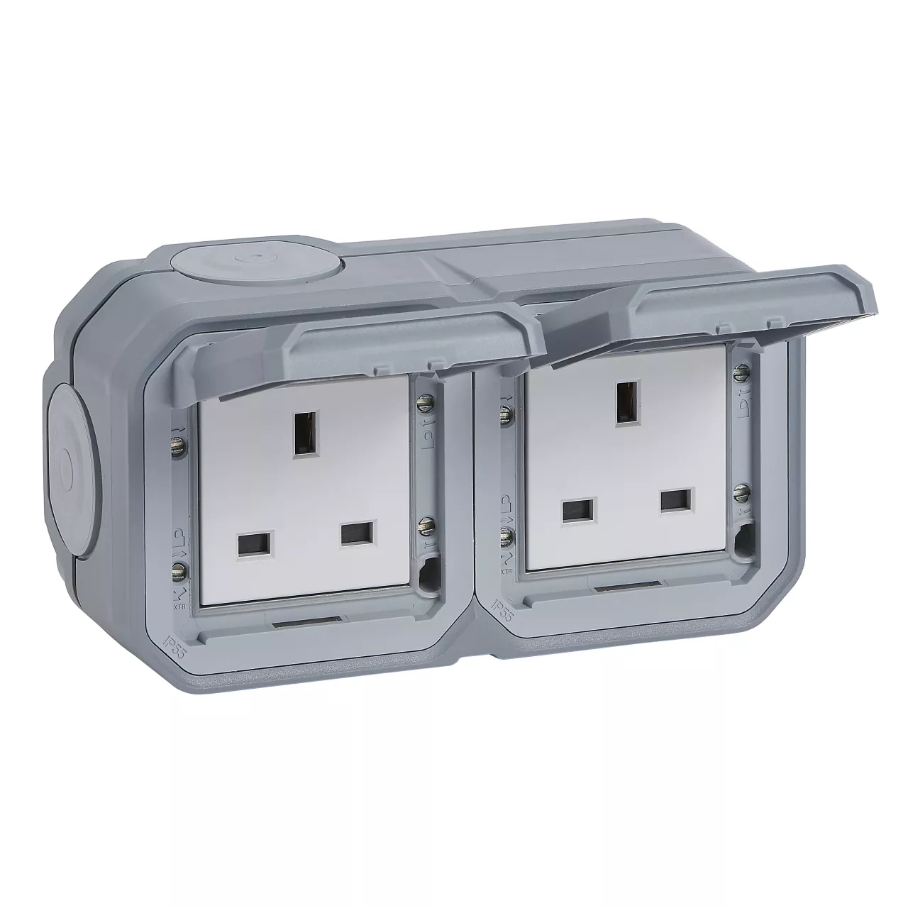 NOWE PLEXO - GN. STD. BRYTYJSKI 2X2P +Z ZACISKI ŚRUB NATYNKOWE 13A-250V~ SZARE