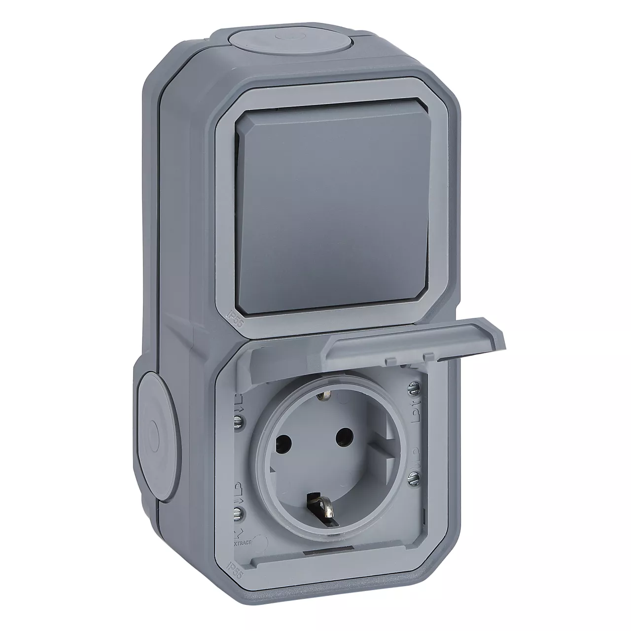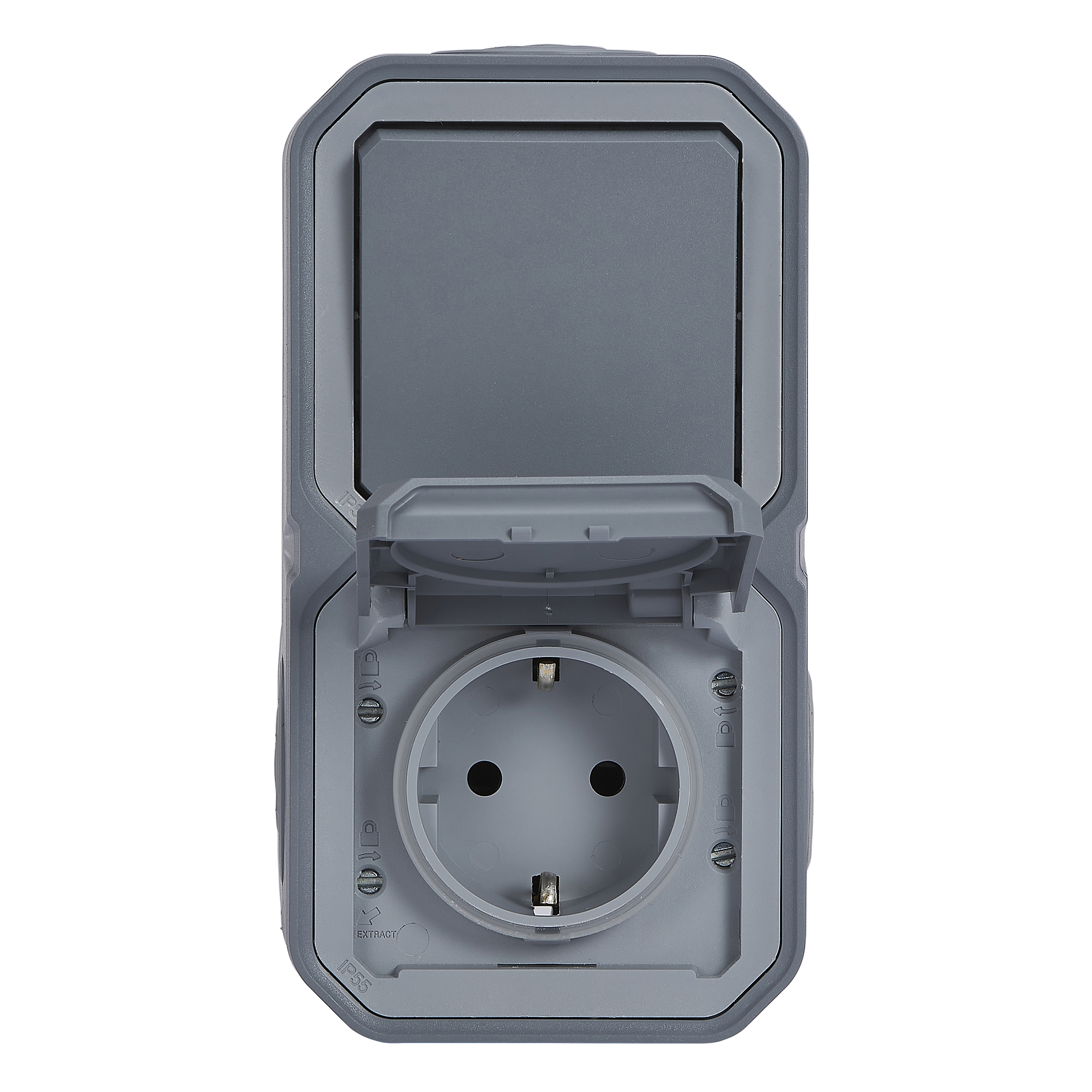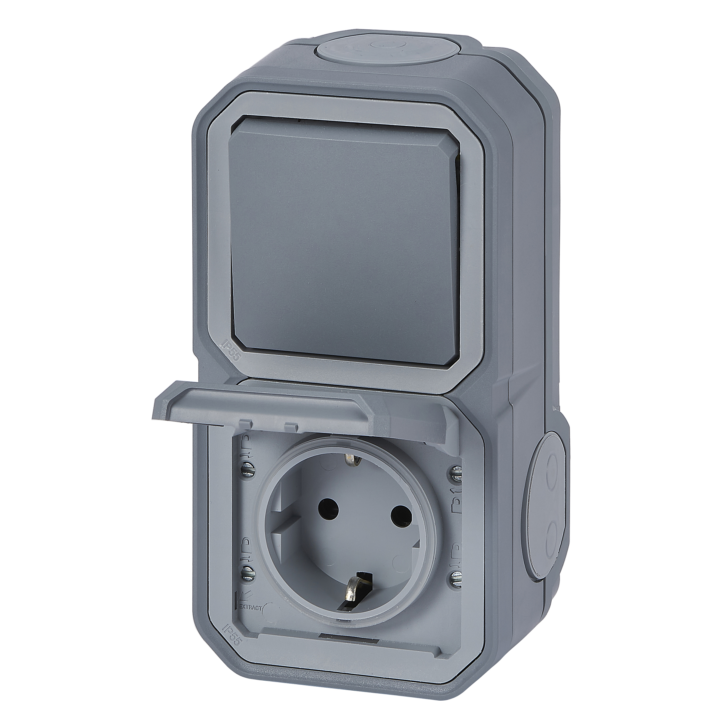 NOWE PLEXO - GN. SCHUKO 2P+Z + ŁĄCZ. SCHODOWY KOMPLET NATYNKOWY 16A- 250V~ SZARE