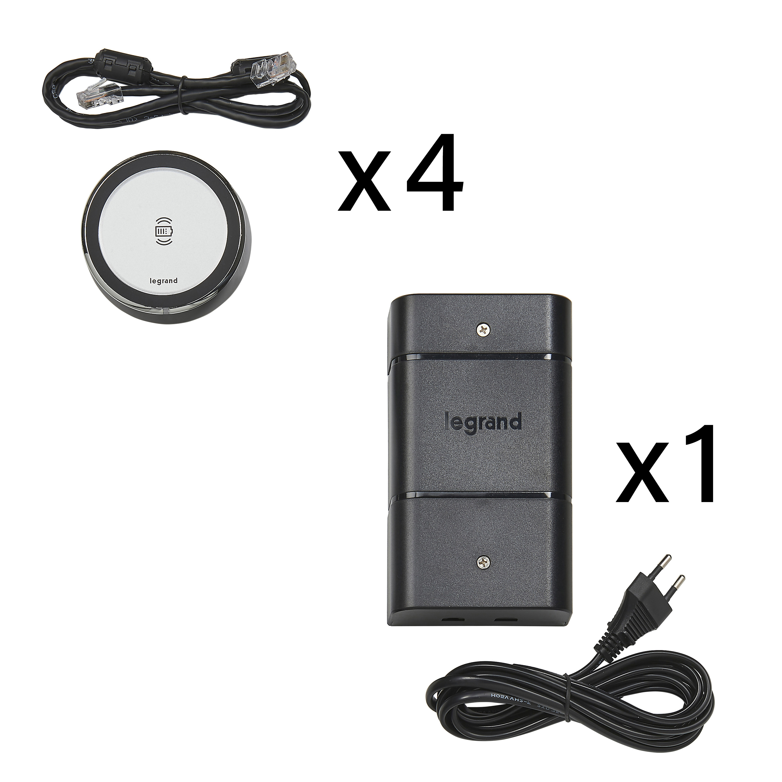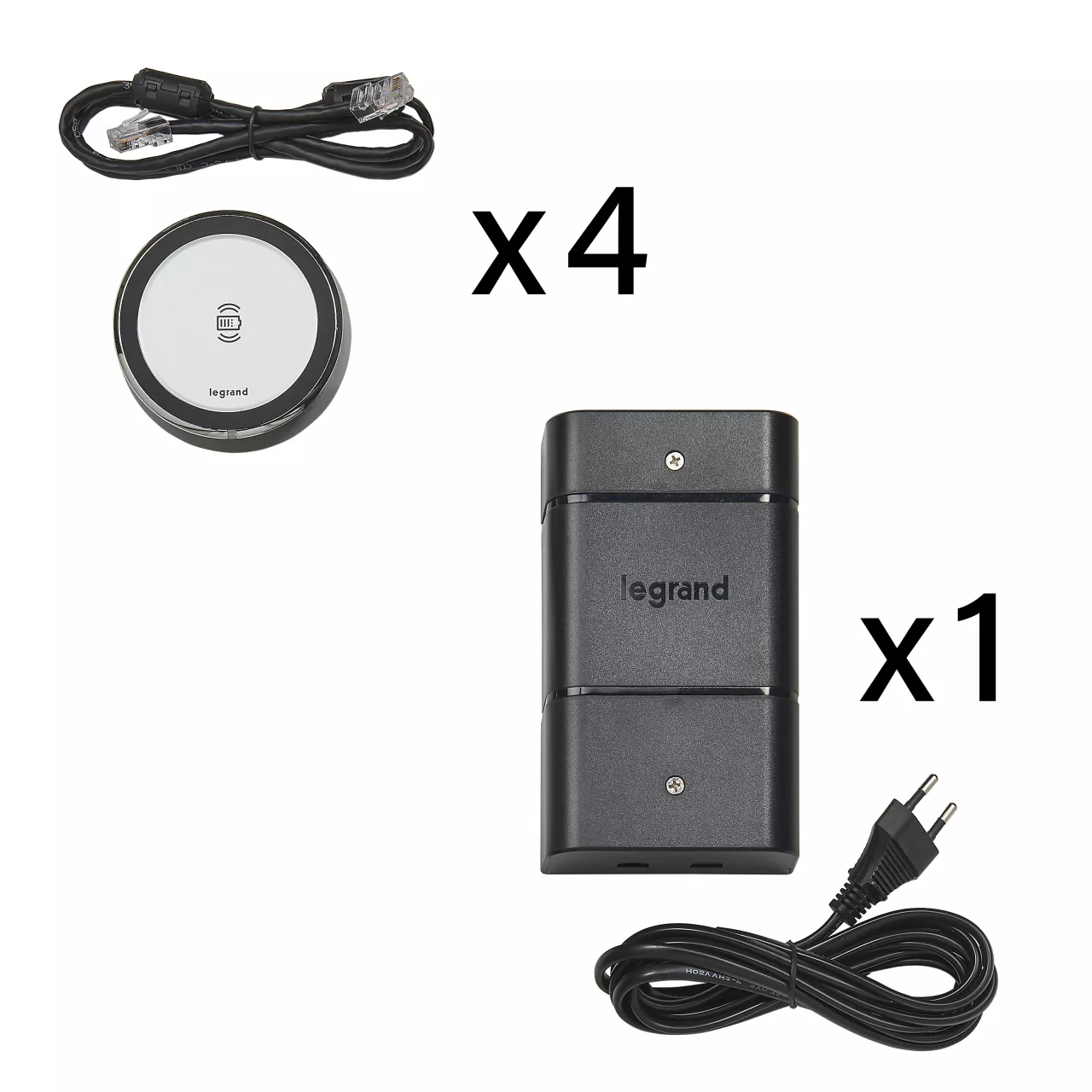 MOSAIC - ŁADOWARKA INDU DO MONTAU W BLACIE MEBLI-4 PADY+ZASILACZ+WTYCZKA EU ALU, Legrand