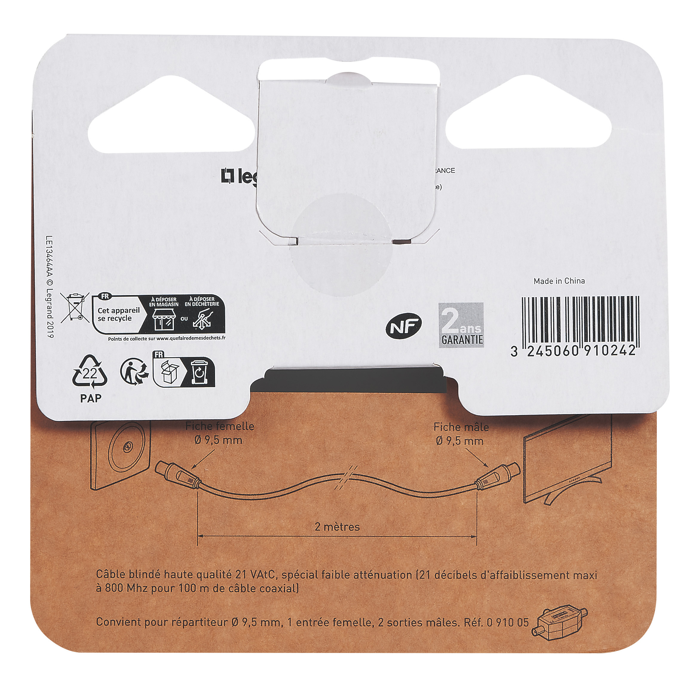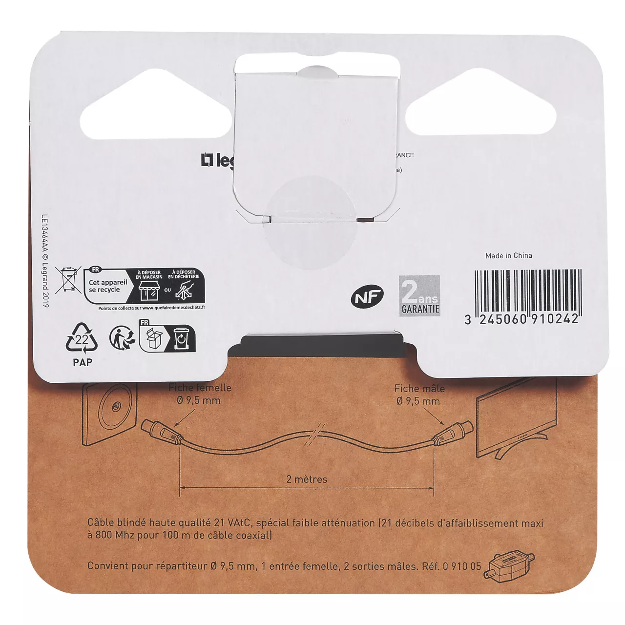 KABEL TV Z 1 WTYKIEM MĘSKIM Ø9,52 MM I 1 WTYKIEM ŻEŃSKIM Ø9,52 MM, DŁUGOŚĆ 2 M, Legrand