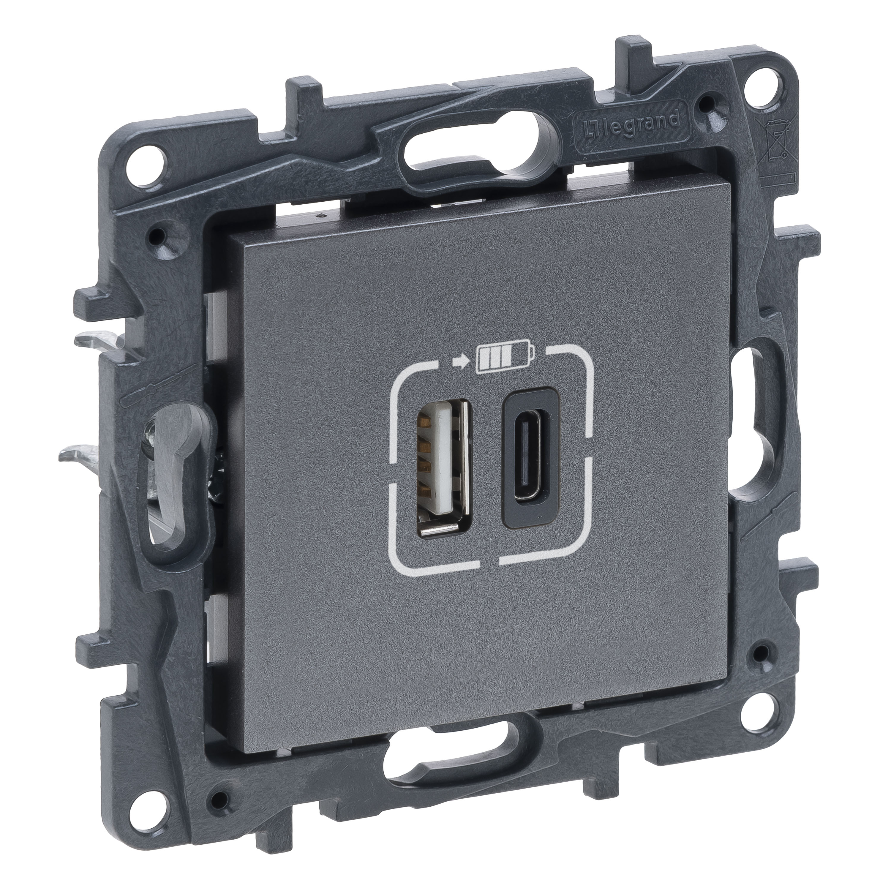 NILOE STEP - GNIAZDO USB 3A TYP A+C - MECHANIZM Z PLAKIETKĄ KOLOR STALOWY, Legrand
