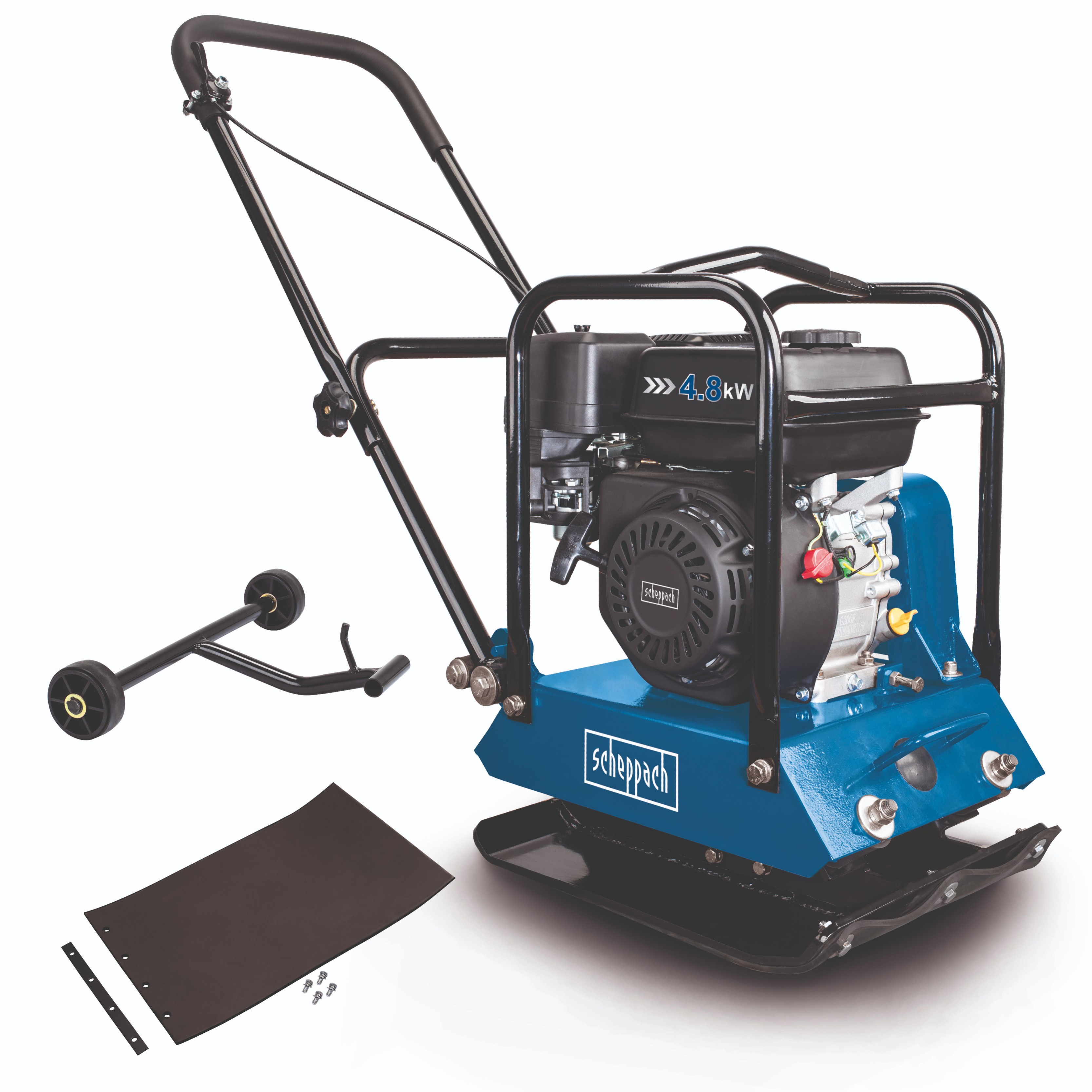 Scheppach HP1200s – Zagęszczarka | 6,5 PS, 4-suwowy silnik benzynowy, 15000 N, w zestawie gumowa mata i wózek transportowy