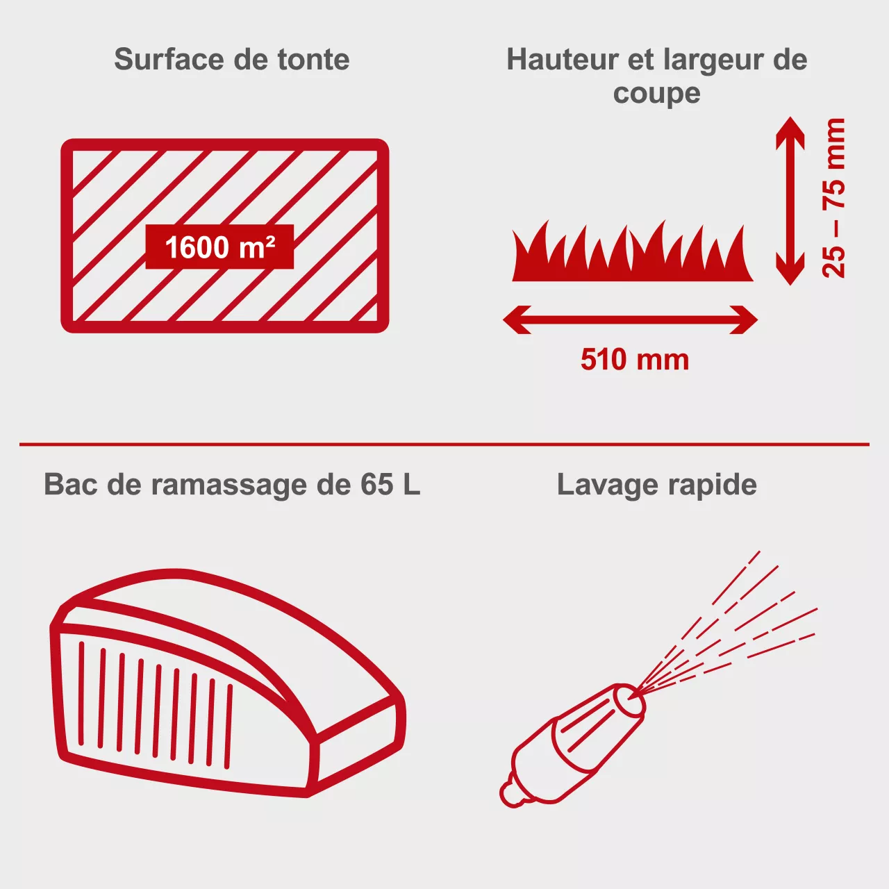 • Mocny silnik 173 cm3, 4,1 KM – wysoka wydajność i niezawodność • Hybrydowy system rozruchu – elektrostart na akumulator IXES 20V lub linka startowa • Napęd własny – łatwe manewrowanie także na większych powierzchniach • Szerokość koszenia 51 cm – szybkie tempo pracy • Centralna regulacja wysokości w 7 stopniach (25–75 mm) • Kosz 65 l z mocnej tkaniny i pokrywą – rzadsze opróżnianie • Funkcje: zbieranie, mulczowanie, wyrzut boczny – elastyczność pielęgnacji • Funkcja czyszczenia z przyłączem wody – szybka konserwacja obudowy • Składany uchwyt i przedni pałąk – łatwe przechowywanie i transport