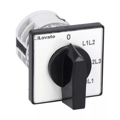 7GN2067U Łącznik krzywkowy serii 7GN, przełącznik woltomierzy, napięcia międzyfazowe, 20A, do montażu tablicowego, z czarnym pokrętłem i tabliczką 48x48mm