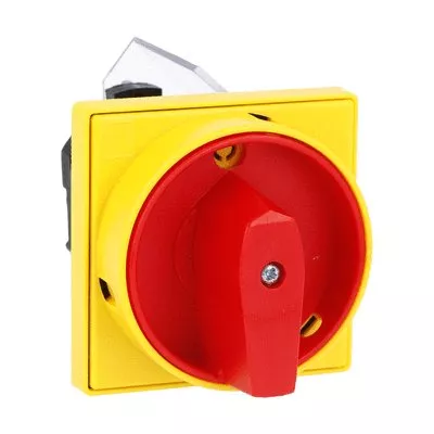 7GN2092U25 Łącznik krzywkowy serii 7GN, rozłącznik, 4 pola, 20A, do montażu tablicowego, z żółto/czerwonym pokrętłem blokowanym w pozycji 0, osłonami zacisków i tabliczką 65x65mm