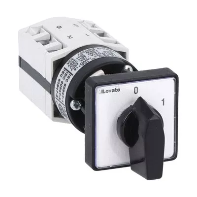 GF1090U47 Łącznik krzywkowy serii GF, rozłącznik, 1 pole, 10A, do montażu tablicowego w otworze 22mm z czarnym pokrętłem, montowanym na zatrzask do korpusu i tabliczką 30x30mm