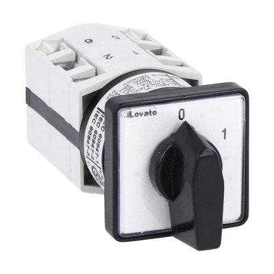 GF1091U Łącznik krzywkowy serii GF, rozłącznik, 2 pola, 10A, do montażu tablicowego, z czarnym pokrętłem i tabliczką 30x30mm