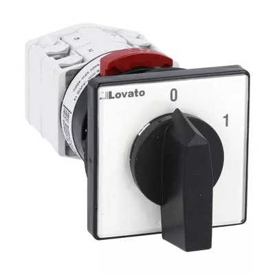 GF2090U47 Łącznik krzywkowy serii GF, rozłącznik, 1 pole, 20A, do montażu tablicowego w otworze 22mm z czarnym pokrętłem, montowanym na zatrzask do korpusu i tabliczką 48x48mm
