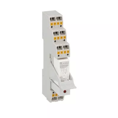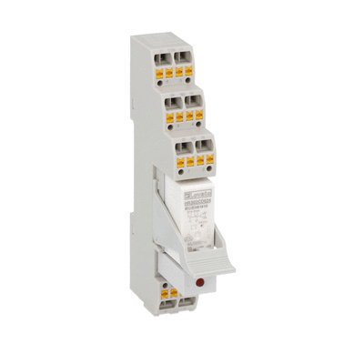 HRA302CD024K5 Zestaw złożony z przekaźnika miniaturowego, 24VDC, 8A, styki 2C/O. Gniazdo z zaciskami sprężynowymi, obejmą wyrzutnikowa i filtrem przeciwzakłóceniowym