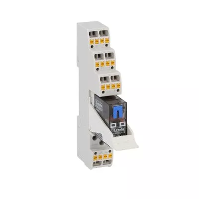 HRA502CD024K3 Zestaw złożony z przekaźnika miniaturowego ze wskaźnikiem LED i przyciskiem mechanicznym, 24VDC, 8A, styki 2 C/O. Gniazdo z zaciskami sprężynowymi i obejmą.