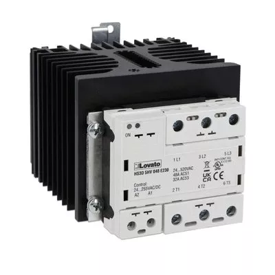 HS3D5HV048E230 Przekaźnik półprzewodnikowy, z radiatorem, 3 fazowy (kontrola 3 faz), 48A, 24…255VAC/DC, zaciski śrubowe