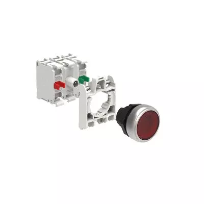 LPCBL104K11PM4 ZESTAW: Przycisk plastikowy podświetlany, samoczynny powrót, kryty, czerwony. Adapter montażowy. Zestyki 1NO+1NC, zaciski śrubowe. Lampka LED, światło ciągłe, zasilanie 185...265VAC.