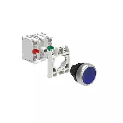 LPCBL106K11PM6 ZESTAW: Przycisk plastikowy podświetlany, samoczynny powrót, kryty, niebieski. Adapter montażowy. Zestyki 1NO+1NC, zaciski śrubowe. Lampka LED, światło ciągłe, zasilanie 185...265VAC.
