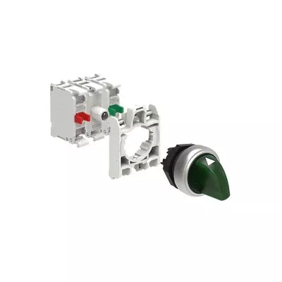 LPCSL130K11PB3 ZESTAW: Przełącznik plastikowy podświetlany, 3 pozycje, 1-0-2, zielony. Adapter montażowy. Zestyki 1NO+1NC, zaciski śrubowe. Lampka LED, światło ciągłe, zasilanie 12...30VAC/DC.