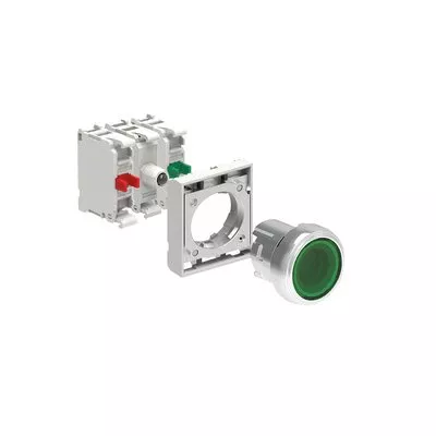 LPSBL103K11PM3 ZESTAW: Przycisk metalowy podświetlany, samoczynny powrót, kryty, zielony. Adapter montażowy. Zestyki 1NO+1NC, zaciski śrubowe. Lampka LED, światło ciągłe, zasilanie 185...265VAC.