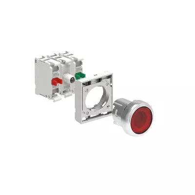 LPSBL104K11PB4 ZESTAW: Przycisk metalowy podświetlany, samoczynny powrót, kryty, czerwony. Adapter montażowy. Zestyki 1NO+1NC, zaciski śrubowe. Lampka LED, światło ciągłe, zasilanie 12...30VAC/DC.
