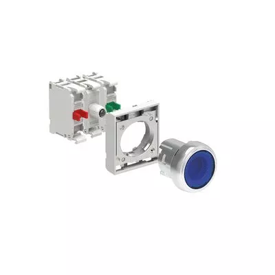 LPSBL106K11PB6 ZESTAW: Przycisk metalowy podświetlany, samoczynny powrót, kryty, niebieski. Adapter montażowy. Zestyki 1NO+1NC, zaciski śrubowe. Lampka LED, światło ciągłe, zasilanie 12...30VAC/DC.