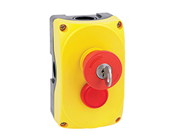 LPZP2B5905 Żółta obudowa LPZP2A5 z przyciskiem grzybkowym LPCB6844, odblokowanie kluczem, 1NO+1NC i czerwona lampka 24V
