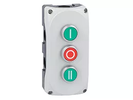 LPZP3B8902 Szara obudowa LPZP3A8 z zielonym przyciskiem krytym LPCB1113 "I" i zestykiem 1NO, czerwonym przyciskiem krytym LPCB1104 "O" i zestykiem 1NC oraz zielonym przyciskiem krytym LPCB1123 "II" i zestykiem 1NO