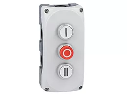LPZP3B8905 Szara obudowa LPZP3A8 z białym przyciskiem krytym LPCB1118 "I" i zestykiem 1NO, czerwonym przyciskiem wystającym LPCB2104 "O" i zestykiem 1NC oraz białym przyciskiem krytym LPCB1128 "II" i zestykiem 1NO