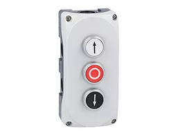 LPZP3B8906 Szara obudowa LPZP3A8 z białym przyciskiem krytym LPCB1158 "strzałka w górę" i zestykiem 1NO, czerwonym przyciskiem krytym LPCB1104 "O" i zestykiem 1NC oraz białym przyciskiem krytym LPCB1152 "strzałka w dół" i zestykiem 1NO
