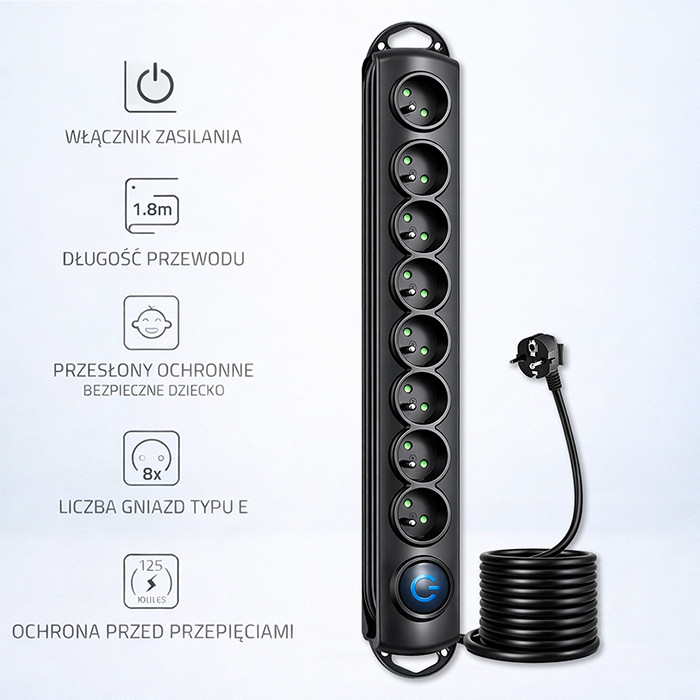 Chcąc zapewnić ochronę Tobie i innym użytkownikom urządzeń podłączonych do listwy wyposażyliśmy ją w następujące zabezpieczenia: