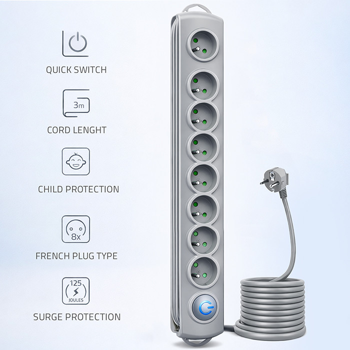 Qoltec Listwa zasilająca antyprzepięciowa | 8 gniazd | 3m | Szara