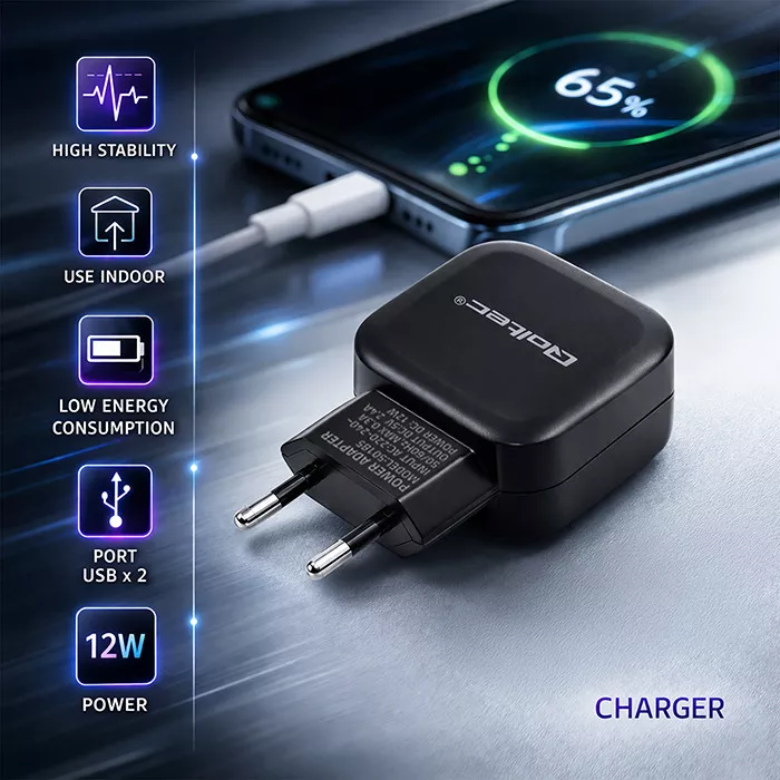 Ładowarka pozwala na ładowanie 2 urządzeń w tym samym czasie, dostosowując napięcie odpowiednie dla podłączonego sprzętu. Przeznaczona do ładowania urządzeń mobilnych takich jak smartfon, tablet, słuchawki , smartwatch, powerbank czy głośniki bezprzewodowe.