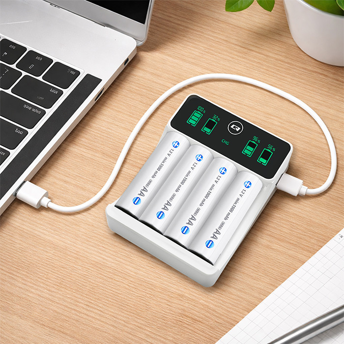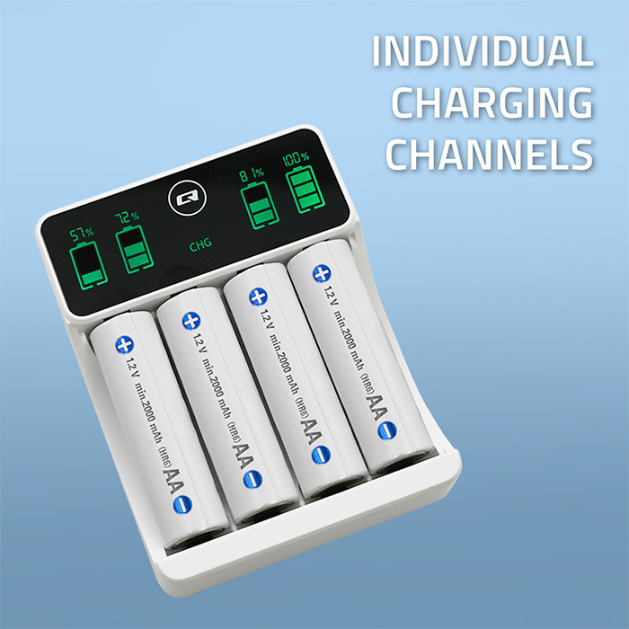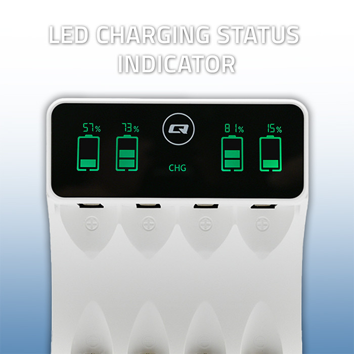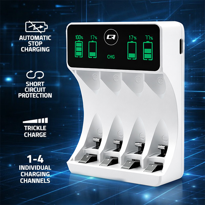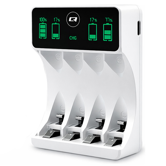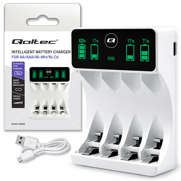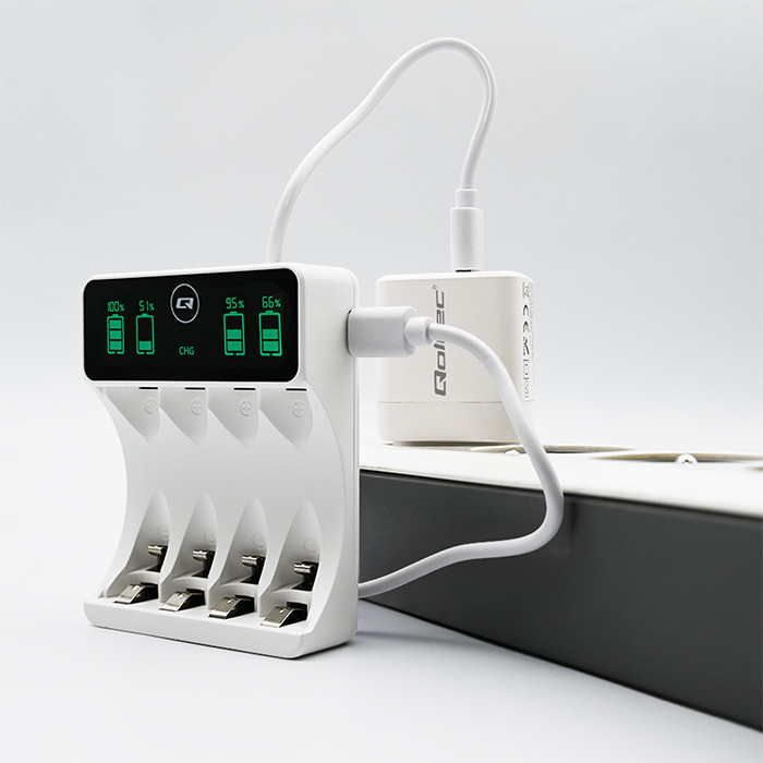 Qoltec Ładowarka do akumulatorków Ni-MH typu R03 AAA R6 AA | LCD | Kabel USB-C | Biała