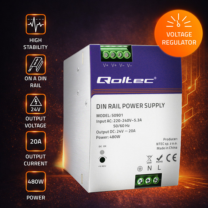 Qoltec Przemysłowy zasilacz na szynę DIN | 480W | 24V | 20A
