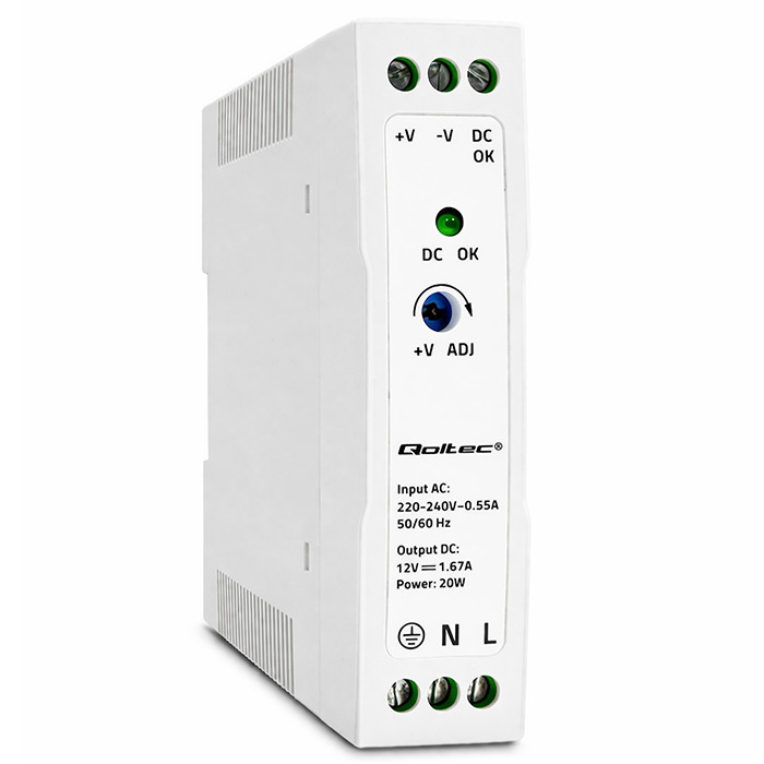Qoltec Zasilacz na szynę DIN | 20W | 12V | 1.67A | Biały | Slim