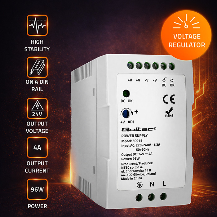Zasilacze na szynę DIN marki Qoltec są przydatnym elementem systemów automatyki, sterowania maszynami, technice oświetleniowej oraz elektronice przemysłowej w których istotny jest rozmiar urządzeń zasilających oraz dostosowanie ich do ograniczonej przestrzeni.