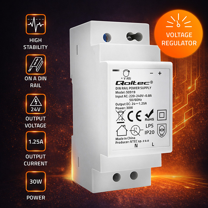 Qoltec Zasilacz na szynę DIN | 30W | 24V | 1.25A | Szary