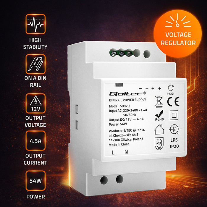 Qoltec Zasilacz na szynę DIN | 54W | 12V | 4.5A | Szary