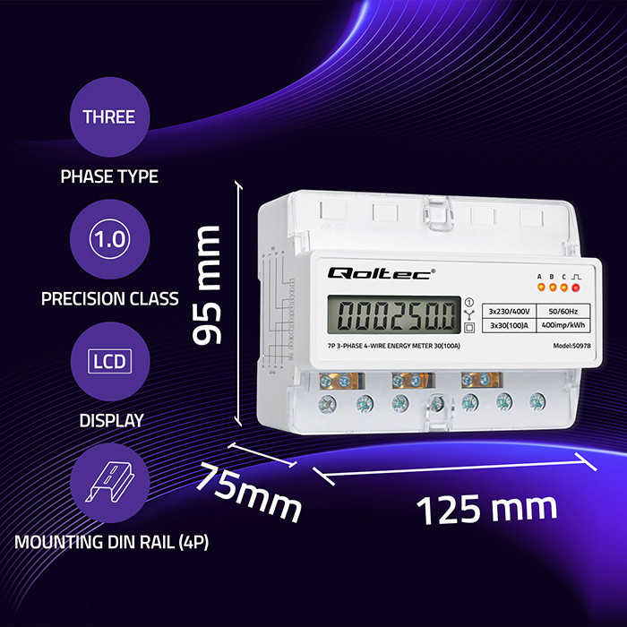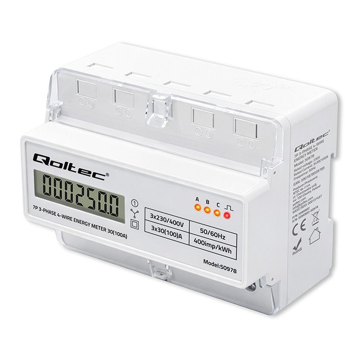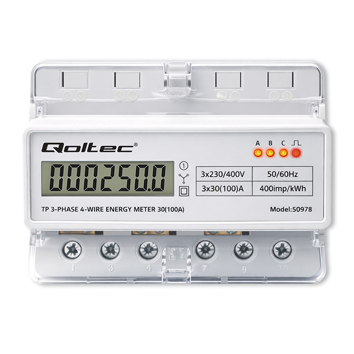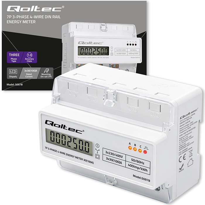 Qoltec Trójfazowy elektroniczny licznik | miernik zużycia energii na szynę DIN | 400V | 100A | LCD | LED | 7P