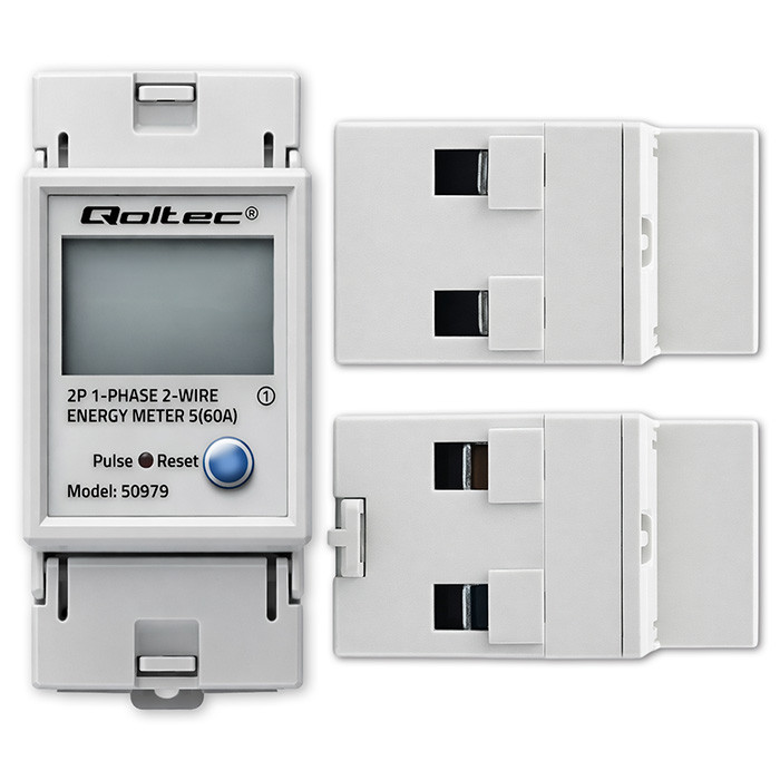 Qoltec Jednofazowy elektroniczny licznik zużycia energii na szynę DIN | RESET | licznik okresowy i stały | 230V | 60A | LCD | LED | 2P